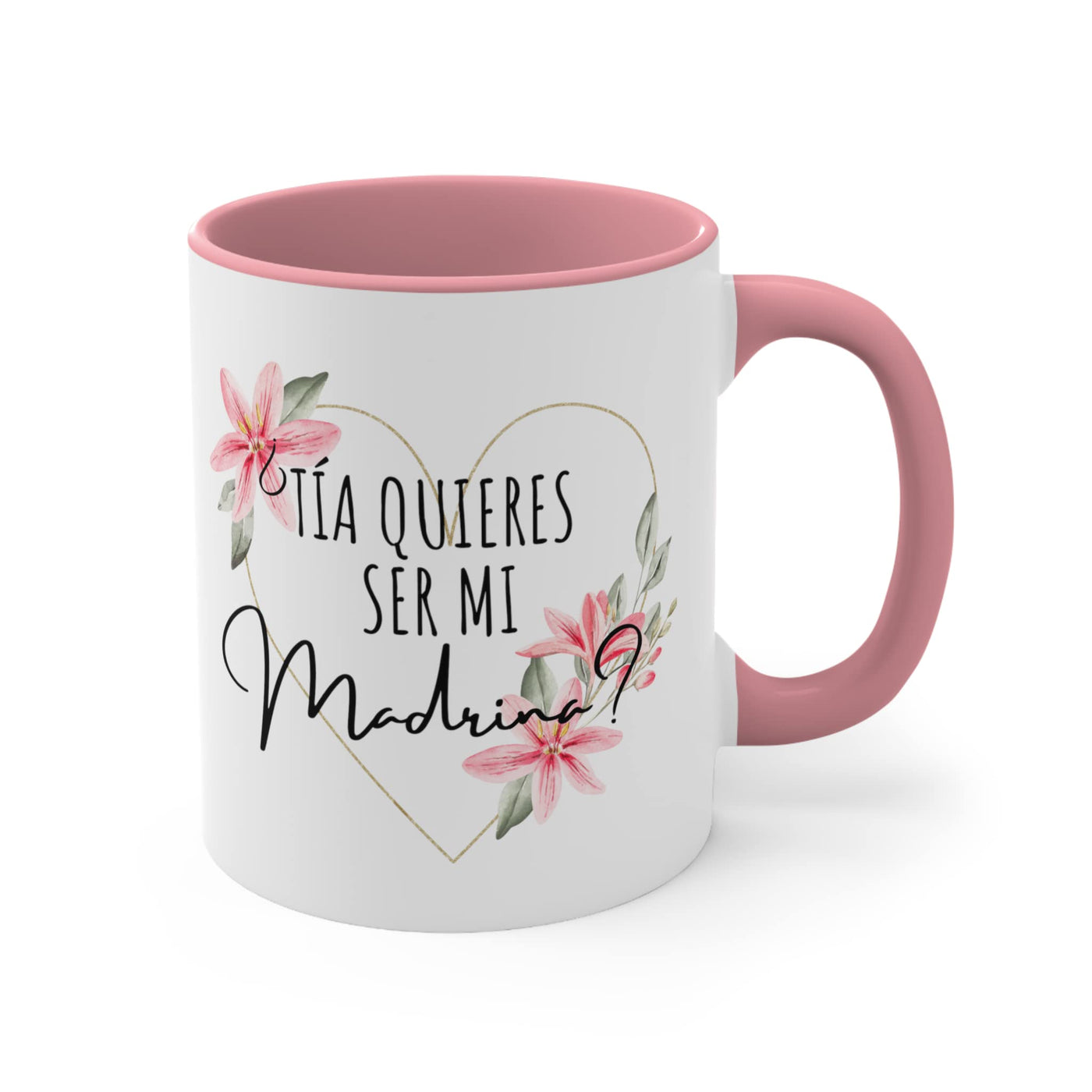 • Q: What is the design theme of this coffee mug? A: The mug features a heartfelt proposal asking if someone would like to be a godmother, presented in Spanish, making it a thoughtful gift for an aunt or godmother.