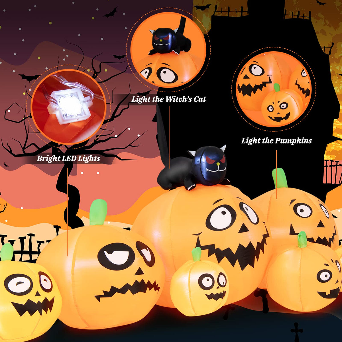 DescriptionAre you looking for a dream Halloween decoration for your little one? Our inflatable pumpkin is a perfect collocation for Halloween holiday. Lifelike witchs cat and smiling pumpkins diffuse impressive festival atmosphere to surroundings, providing them with funny and impressive festival atmosphere. Bright LED Lights also bring much more joy for the nighttime, which ensures a better viewing at nighttime and attracts childrens attention at first sight. Waterproof polyester fabric features remarkable reinforcement and durability for long-term use. Necessary accessories greatly improve its stability without worries about flying away by the wind. Whats more, the inflatable Halloween decoration can be used both indoor and outdoor occasions, such as yard, lawn, and party.FeatureSoak in strong festival atmosphere with our inflatable pumpkinsBuilt-in LED lights create a memorable scene during the holiday seasonPerfect Halloween decoration to attract family, guests and neighbors, etcDurable polyester fabric is waterproof and abrasion resistantPowerful air blower completes inflation within few minutesSmooth zipper brings much convenience to deflateNecessary accessories include ground stakes for higher stability Eye-catching decoration for Halloween party, courtyard, lawn, etcSpecificationColor: Orange, BlackMaterial: Polyester FabricOverall Dimension: 8ft x 3.1ft x 3.8ft (L x W x H)Net Weight: 2.2 lbsPackage Includes:1 x Halloween Inflatable Pumpkins4 x Ground Stakes1 x AdapterWhy You Choose Our 8ft Long Halloween Inflatable Pumpkins?vDurable polyester fabric features waterproof and abrasion resistant vLifelike pumpkins create a memorable scene during the holiday season