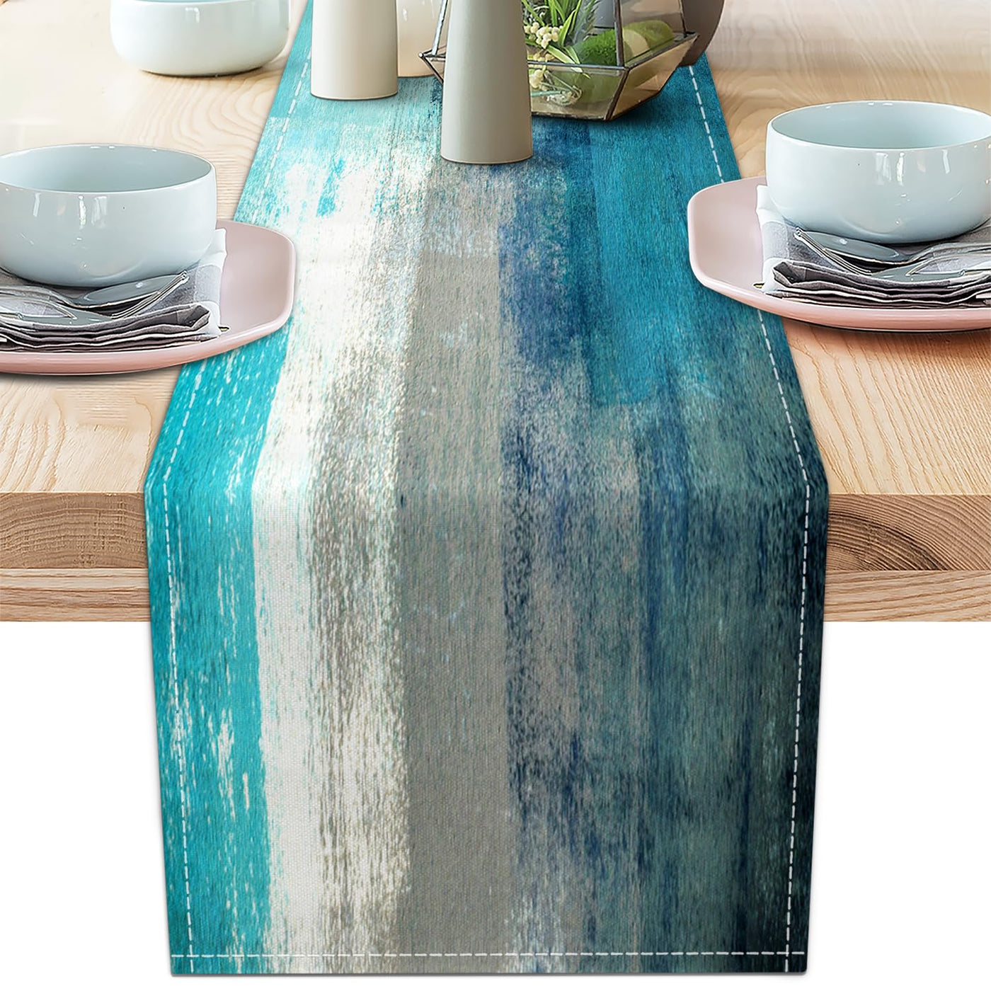 Teal Grey Table Runners Modern Art Farmhouse Linen Table Runners Dresser Scarves Retro Rustic Style for Party Kitchen Dining Tab