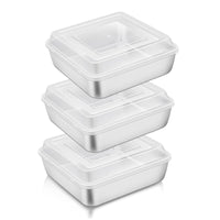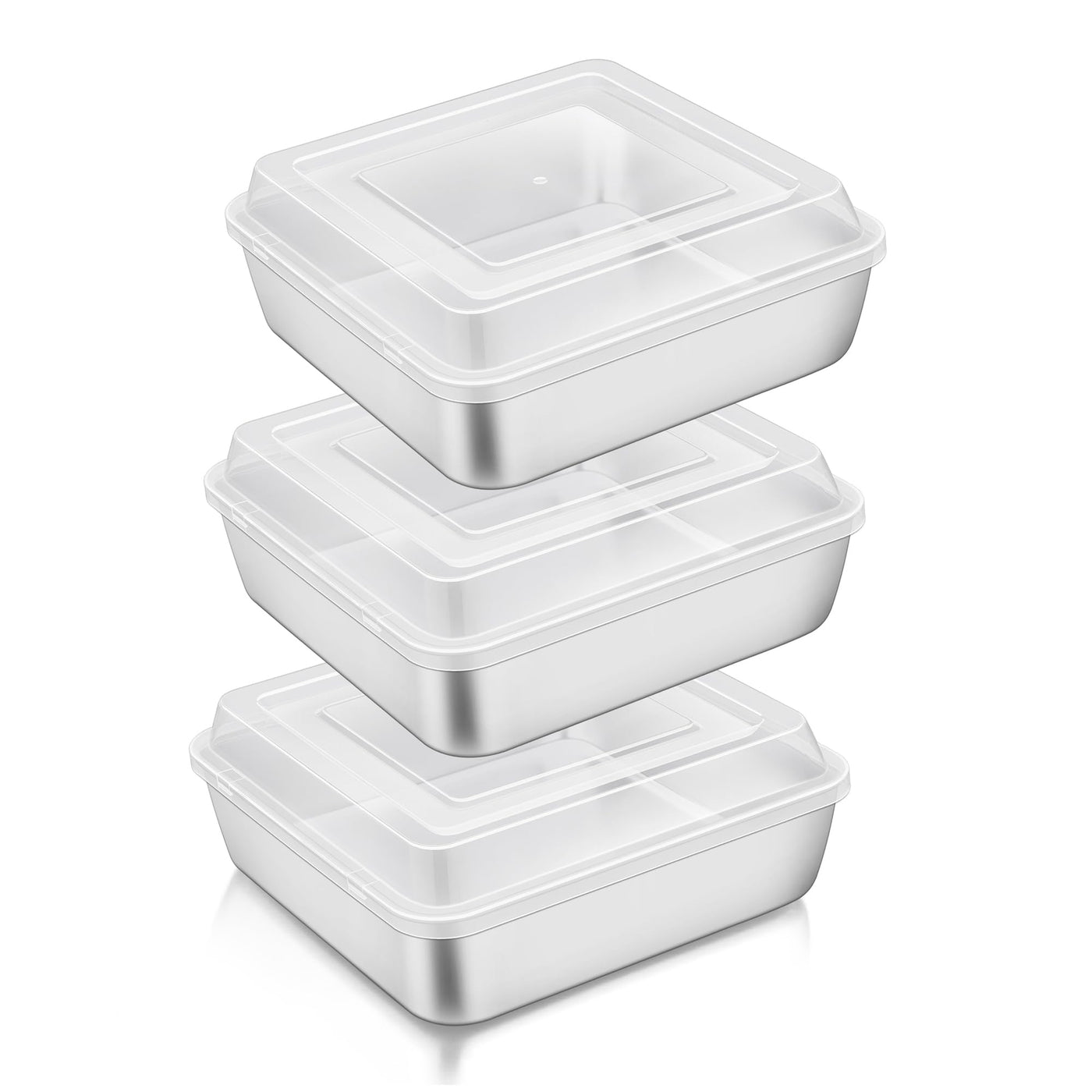 - Q: How many pans and lids are included in the set? A: The set includes 3 square cake pans and 3 clear plastic lids.
