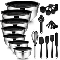 - Q: What additional items are included in this set? A: The TeamFar mixing bowls set includes 16 cooking utensils made from food-grade silicone, such as spatulas, a whisk, and measuring spoons and cups.