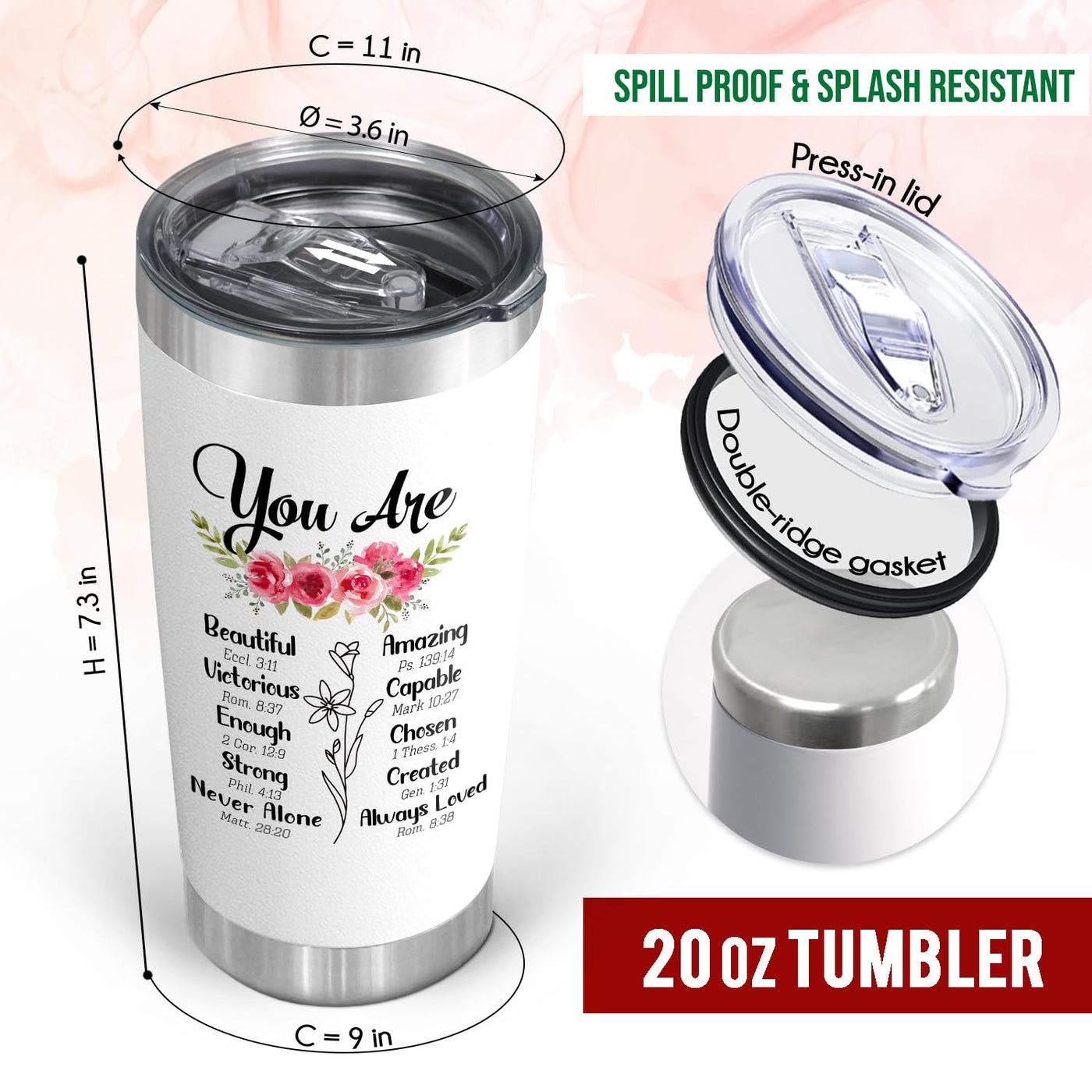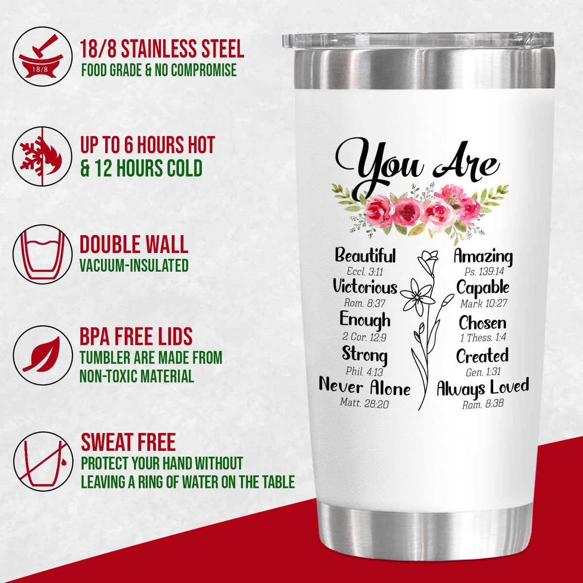 - Q: What makes this tumbler a good Christian gift? A: The tumbler features motivational quotes that serve as encouragement, making it an ideal Christian gift for women who appreciate faith-based inspiration.