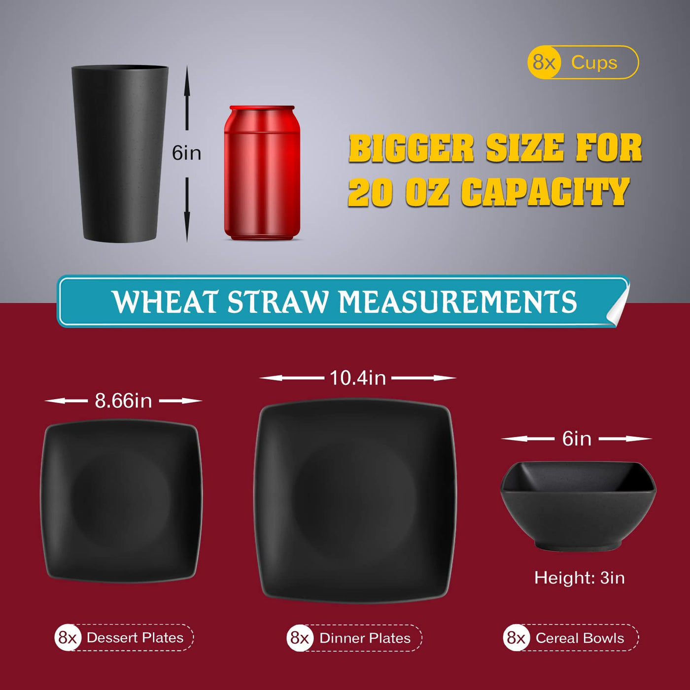 Teivio 32-Piece Plastic Wheat Straw Square Dinnerware Set For 8, Unbreakable Dinner Plates, Salad Plates, Snack Bowls, Tumblers