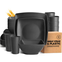 • Q: What materials are used to make the dinnerware set? A: The dinnerware set is made from a combination of wheat straw and plastic, which provides durability without the risk of breaking or chipping.