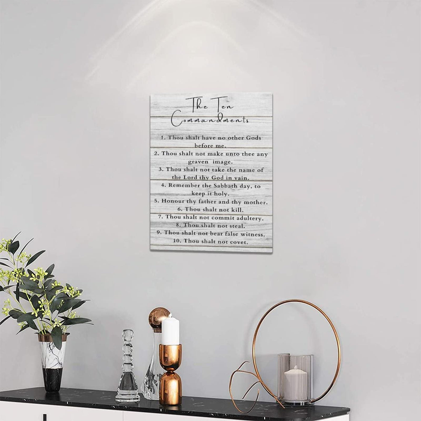 - Q: What are the dimensions of the Ten Commandments Wall Decor? A: The Ten Commandments Wall Decor measures 12 inches by 16 inches.