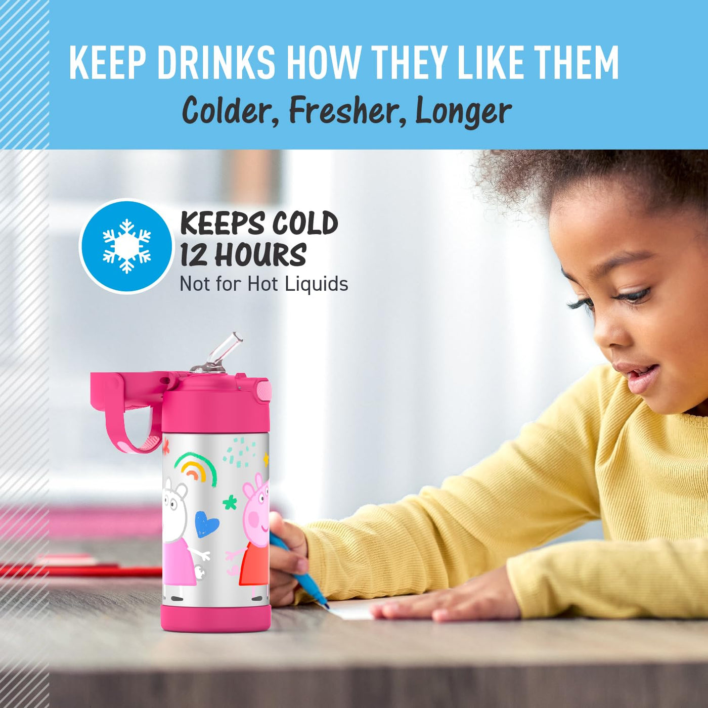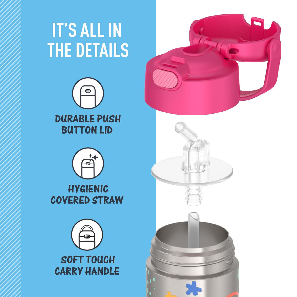 - Q: Is this water bottle safe for kids? A: Yes, the THERMOS FUNTAINER is designed with a kid-friendly design and features a hygienically covered silicone straw.