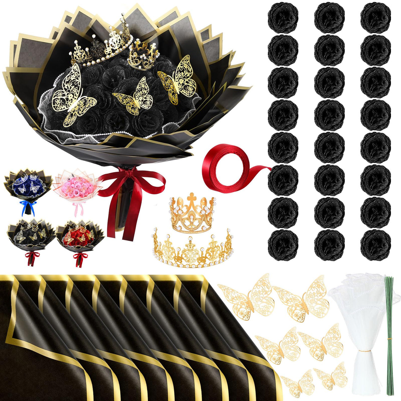 Features: The glitter roses bouquet makes an ideal gift for various occasions, offering a timeless means of expressing heartfelt emotions. The bouquets black hue adds a touch of warmth and sophistication, ensuring it stands out in most settings. Specifications: Material: Rose: non woven fabrics Color: mainly black Size: Rose: approx. 2.76 inches/ 7 cm in diameter and approx. 3.15 inches/ 8 cm in height Wrapping paper: approx. 22.83 x 22.83 inches/ 58 x 58 cm Package yarn after straightening: approx. 11.02 inches/ 28 cm in width and approx. 78.74 inches/ 200 cm in length Crown: approx. 2.13 x 1.5 inches/ 5.4 x 3.8 cm and approx. 5.51 x 2.24 inches/ 14 x 5.7 cm Flower stem: approx. 11.81 inches/ 30 cm long and approx. 0.08 inch/ 2 mm in width 3D butterfly: approx. 4.72 x 3.35 inches/ 12 x 8.5 cm, approx. 3.94 x 2.76 inches/ 10 x 7 cm and approx. 3.15 x 2.17 inches/ 8 x 5.5 cm Ribbon: approx. 24.06 yd/ 22 m long and approx. 0.98 inch/ 2.5 cm in width Package includes: 24 x Artificial rose head 24 x Flower stem 2 x Crowns 6 X 3D butterfly 8 Sheet of wrapping paper 1 Roll of ribbon 1 x Package yarn Notes: Manual measurement, please allow slight errors on size. The color may exist a slight difference due to different screen displays. Winding risk may exist, please keep our product away from children.