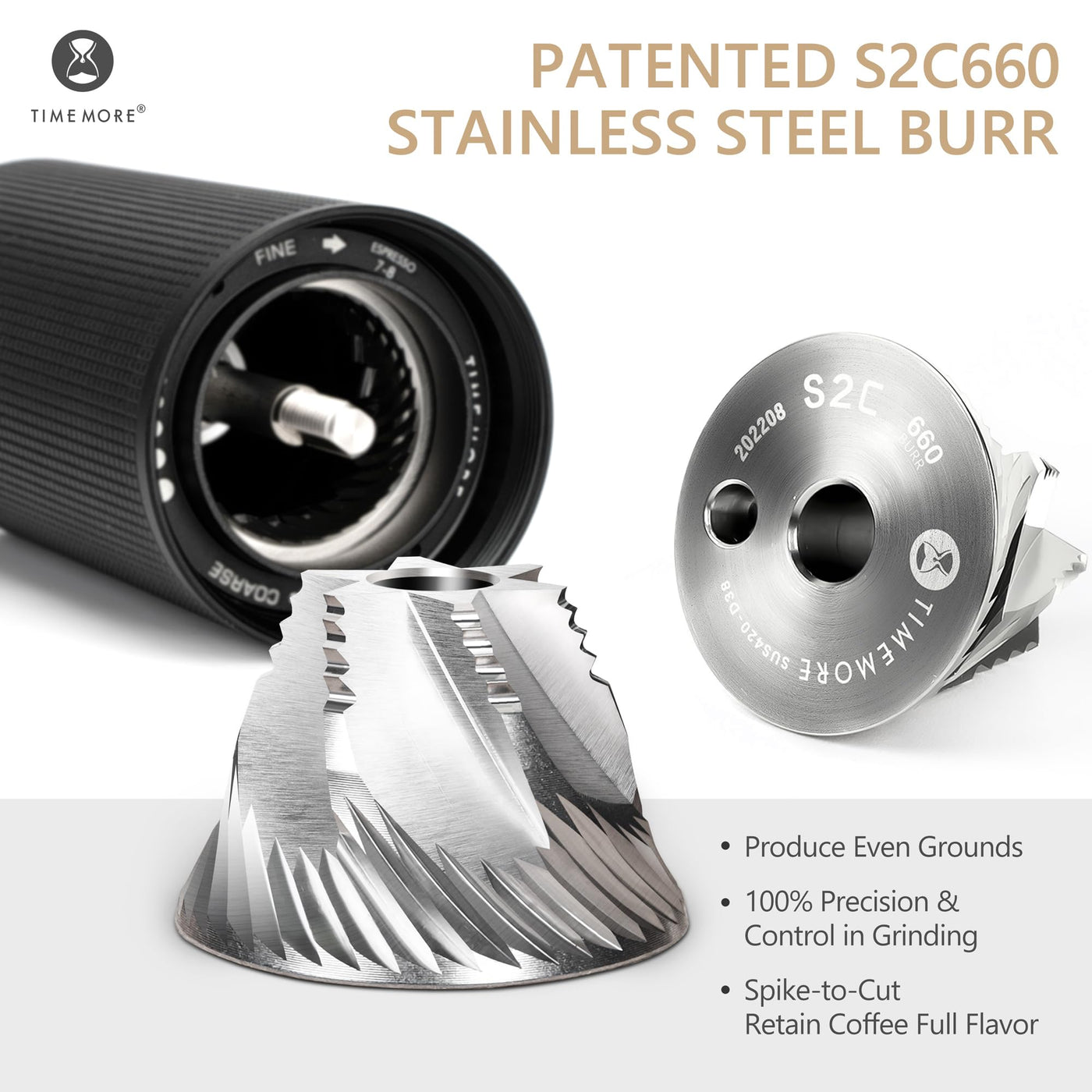 - Q: How does the S2C conical burr enhance the grinding process? A: The S2C conical burr design provides consistent and even grind sizes, which ensures optimal flavor extraction from the coffee beans while minimizing heat generation during grinding.