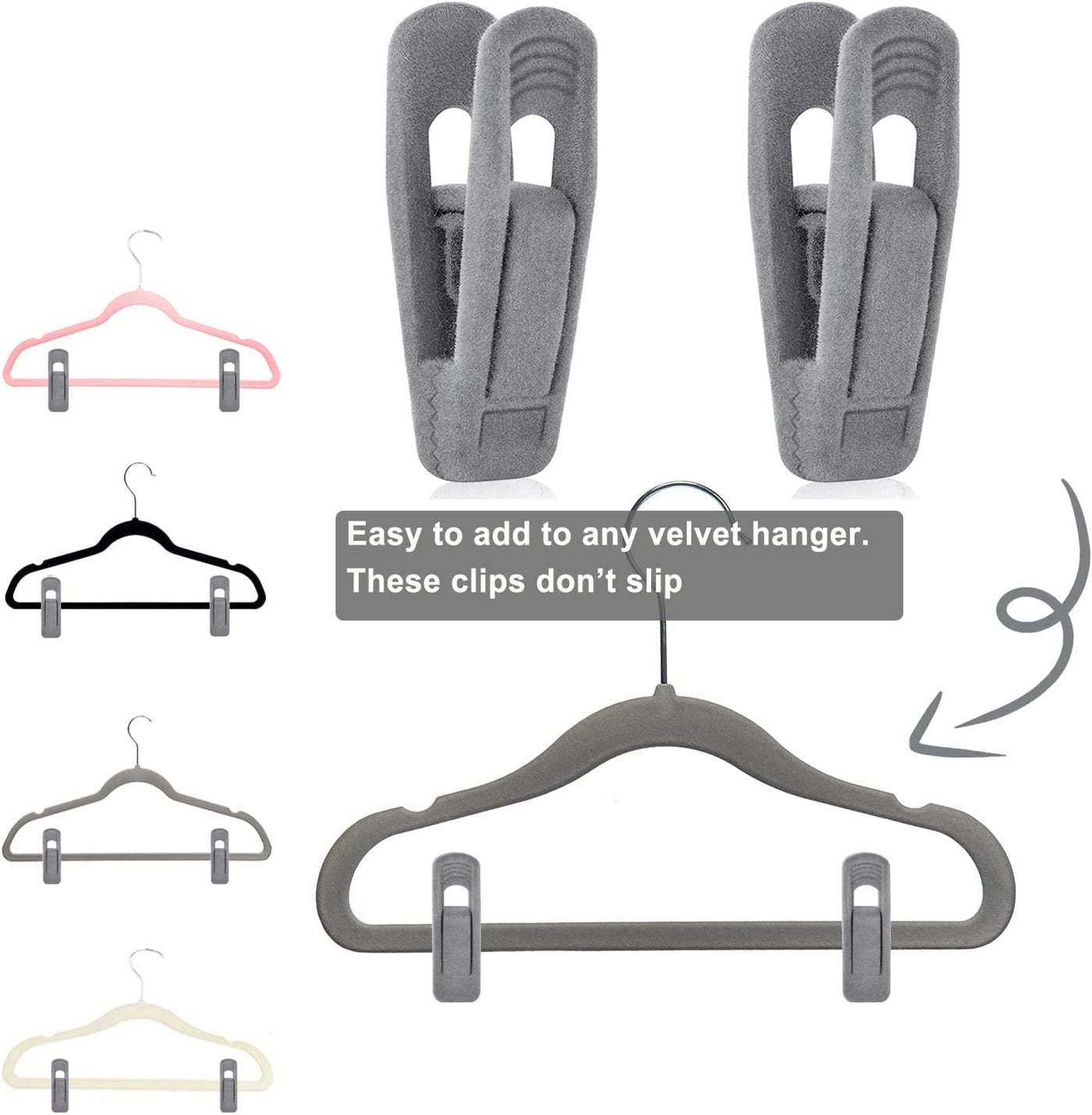 - Q: Do these clips work with standard velvet hangers? A: Yes, these clips are designed to work perfectly with standard velvet hangers, including kid and baby hangers.