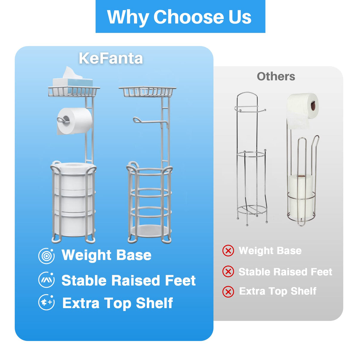 - Q: Does the holder have a stable base? A: Yes, the holder features a solid base with raised feet that keeps the toilet paper off the ground and provides extra stability to prevent tipping.