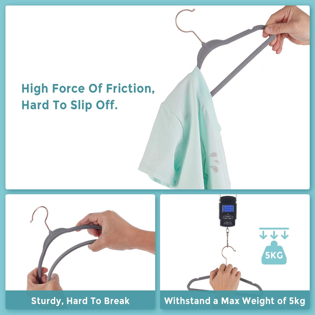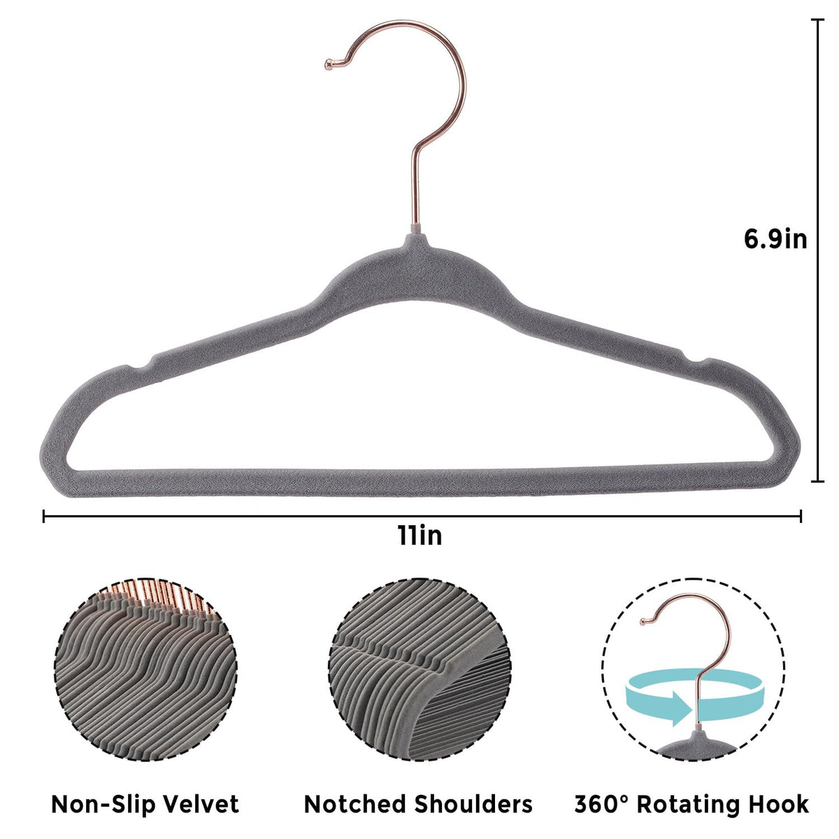 • Q: Do the hangers have any special design features? A: Yes, they feature soft velvet flocking for a non-slip surface, shoulder notches for strappy clothing, and a rose gold hook that swivels 360 degrees.
