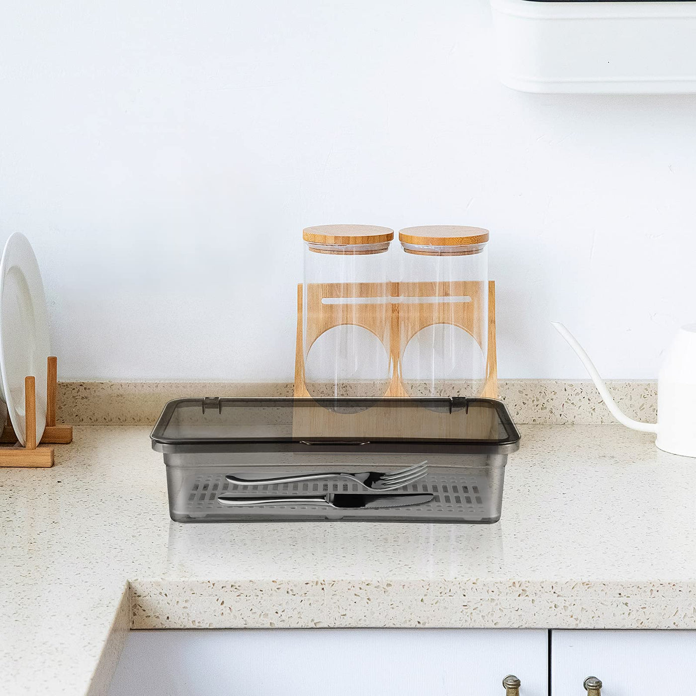 - Q: What utensils can I store in this organizer? A: This organizer is versatile and can be used to store chopsticks, forks, spoons, knives, and other kitchen utensils.