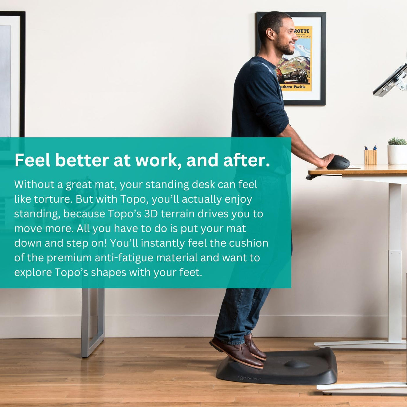 - Q: What is the Topo Comfort Mat by Ergodriven? A: The Topo Comfort Mat is an anti-fatigue standing desk mat specifically designed to enhance comfort and support while standing at work. It features a unique 3D Calculated Terrain that encourages movement and reduces fatigue.