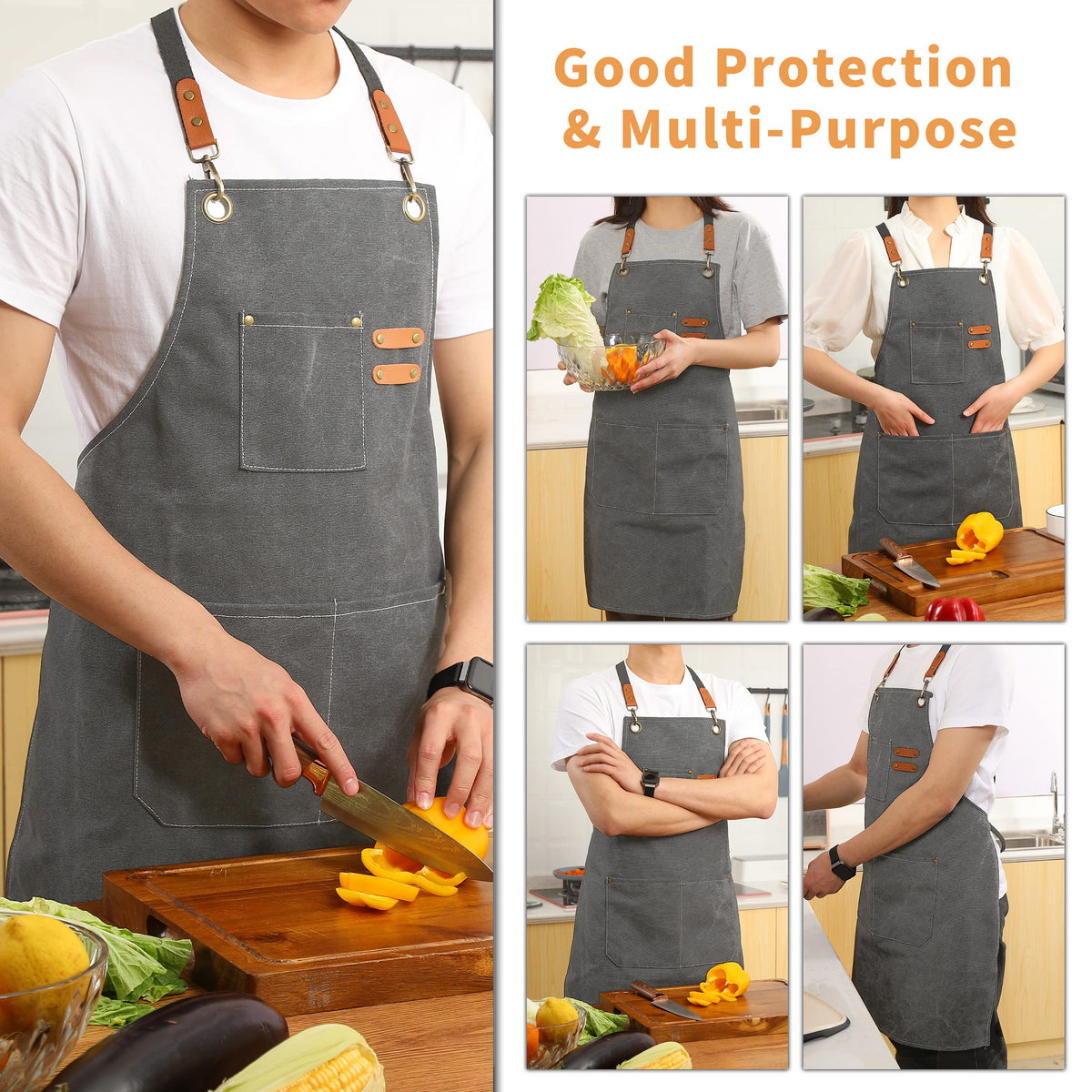 • Q: Can the straps be adjusted to fit different sizes? A: Yes, the apron features adjustable and removable cross-back straps, accommodating a wide range of sizes up to men's XXL.
