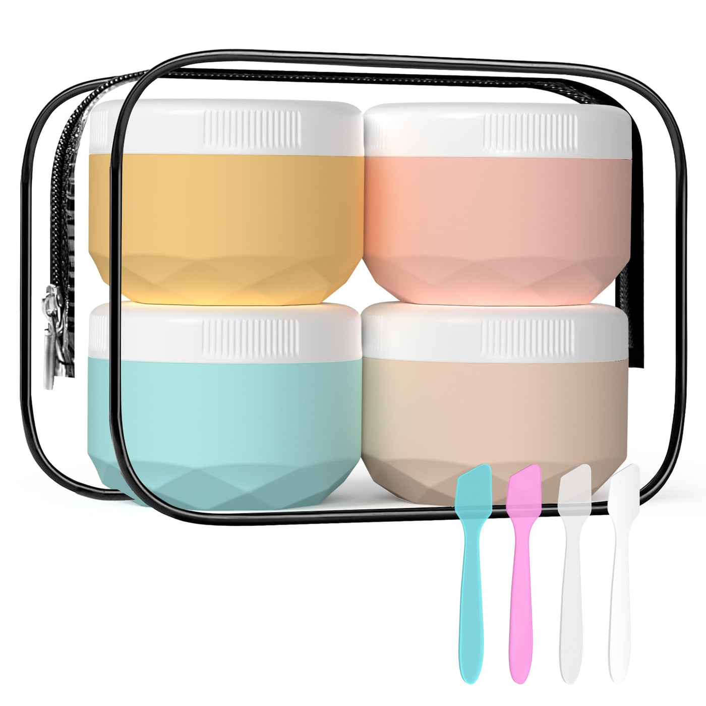 - Q: Do the jars come with any accessories? A: Yes, the set includes 4 silicone cream jars, a waterproof bag, and 4 spatulas for easy product transfer.