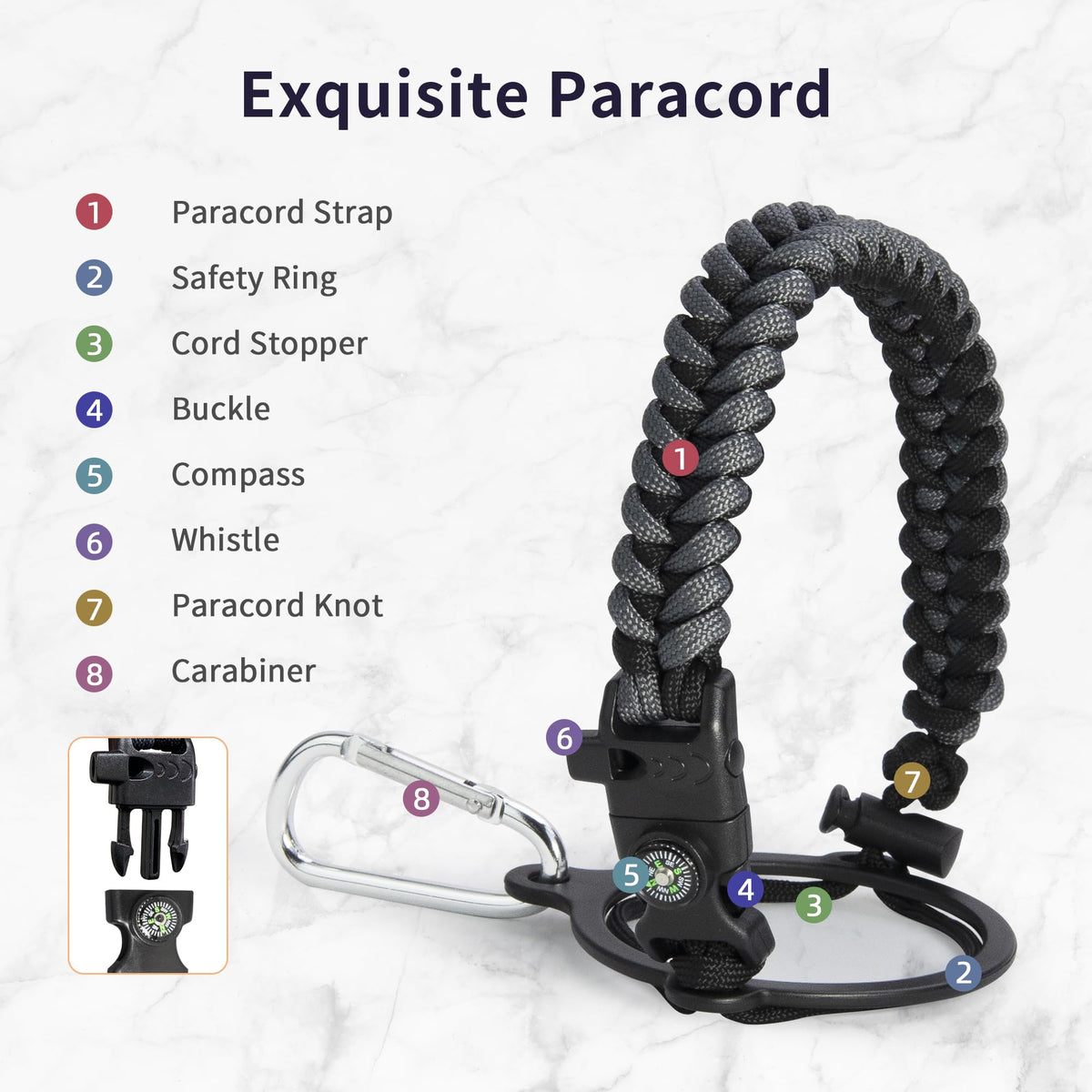 - Q: What is the purpose of the paracord handle? A: The full-function paracord handle not only allows for easy carrying but also includes a compact compass and carabiner for emergency situations.