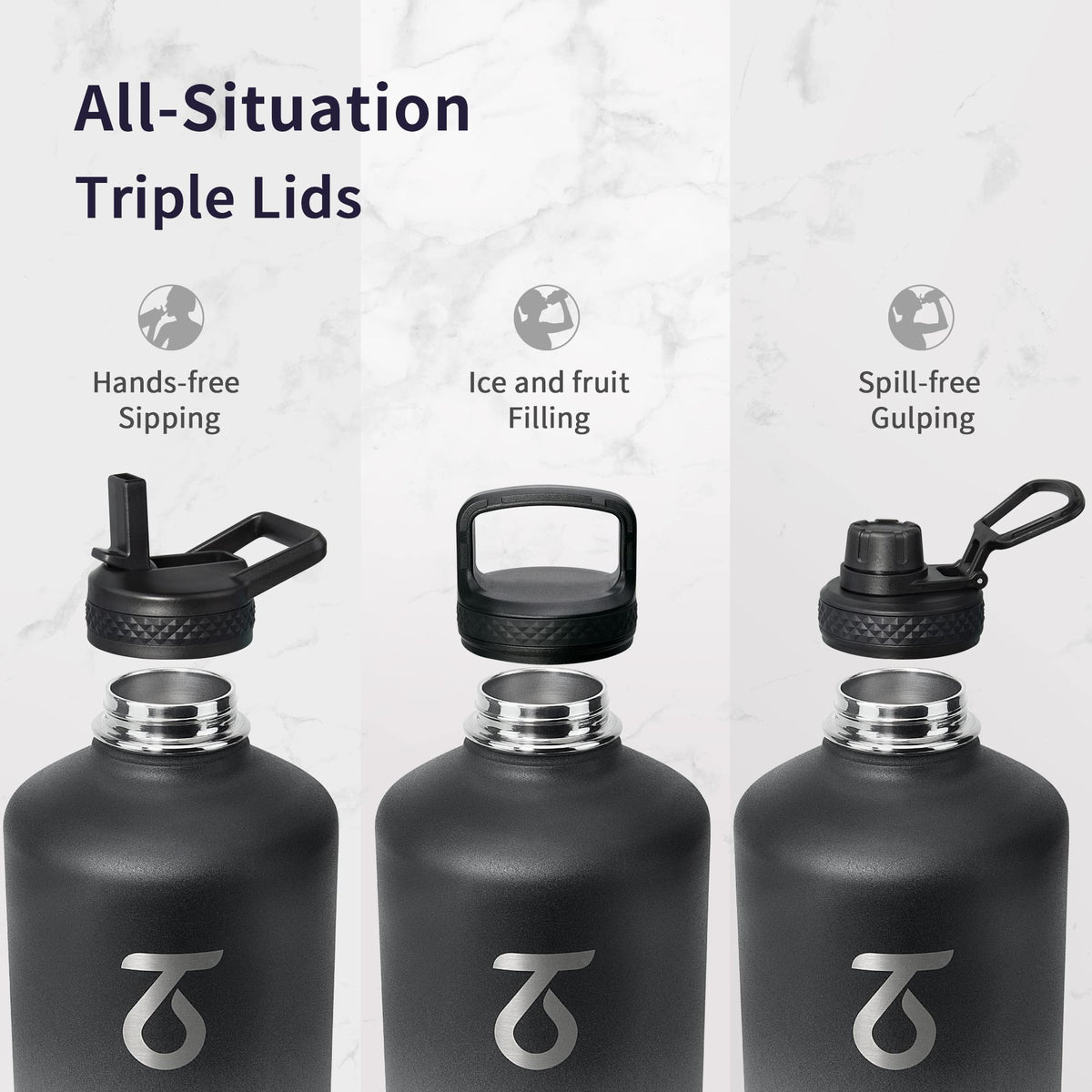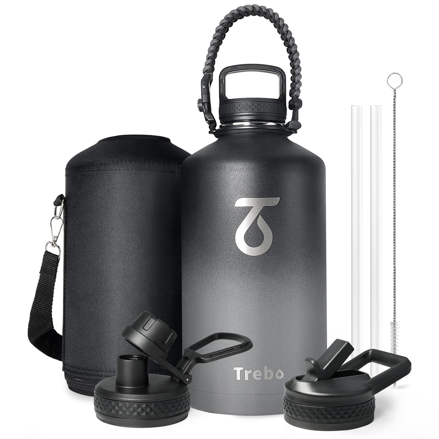 - Q: What types of lids come with the Trebo water bottle? A: The bottle comes with three types of lids: a flip-up straw lid, a spout lid for easy drinking, and a wide mouth lid for refilling ice.