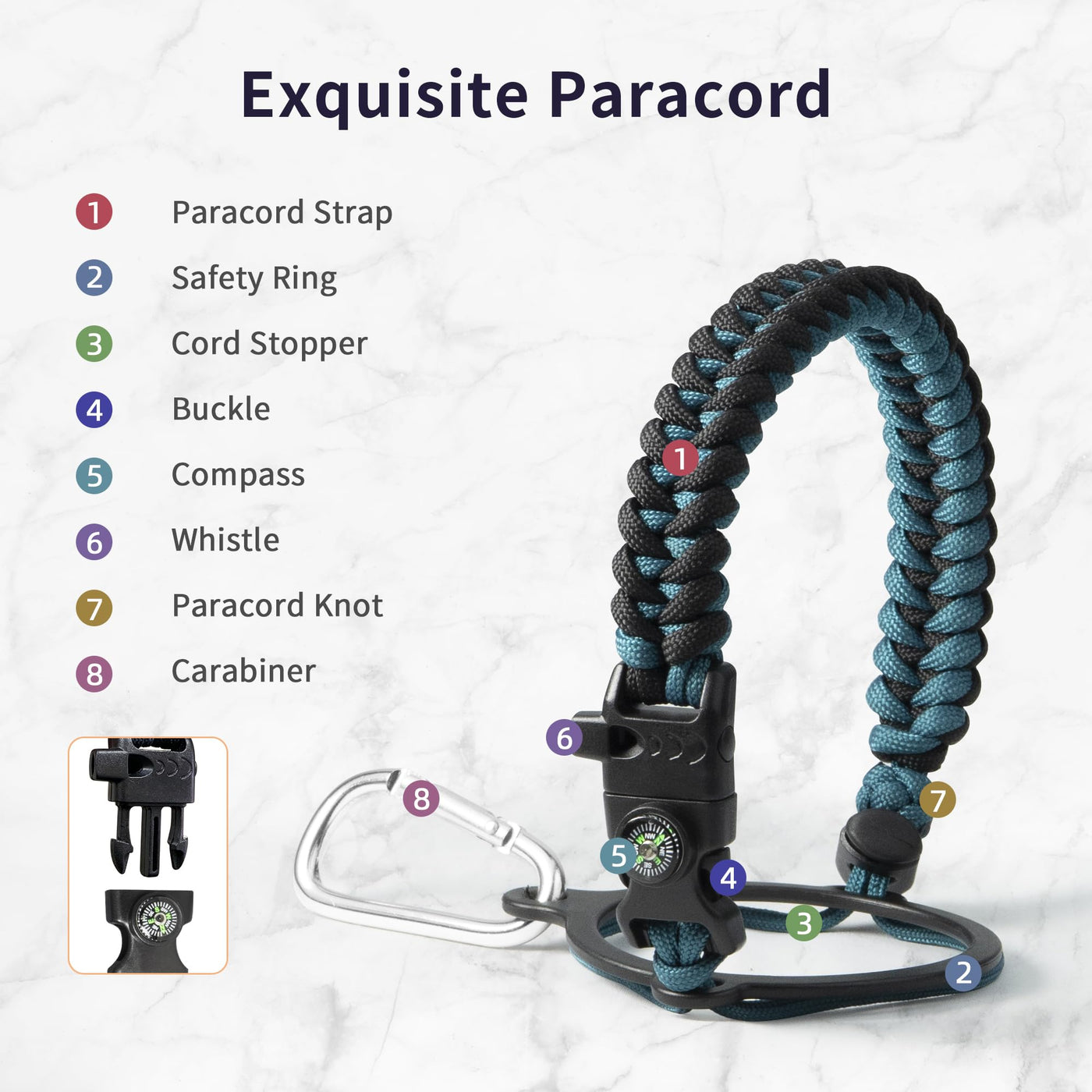 - Q: What is the purpose of the paracord handle? A: The paracord handle adds a stylish touch and is designed for easy carrying. It also includes a compact compass and a handy carabiner for outdoor use.