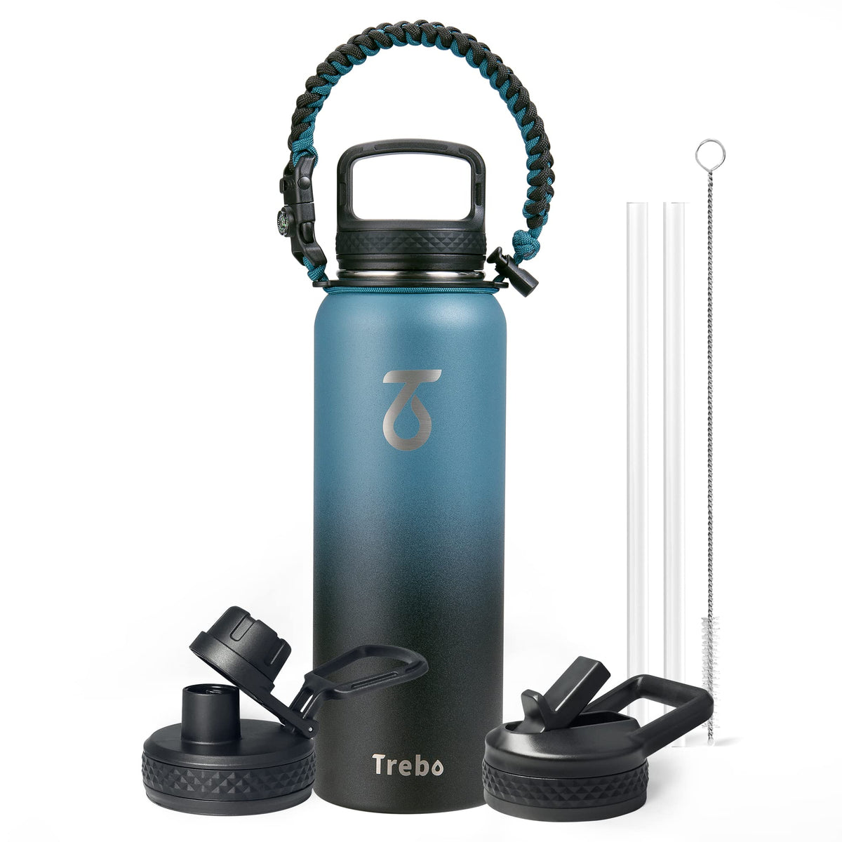 - Q: What types of lids are included with the bottle? A: The Trebo water bottle includes three types of lids: a flip-up straw lid, a spout lid for drinking, and a wide mouth lid for easy filling and cleaning.