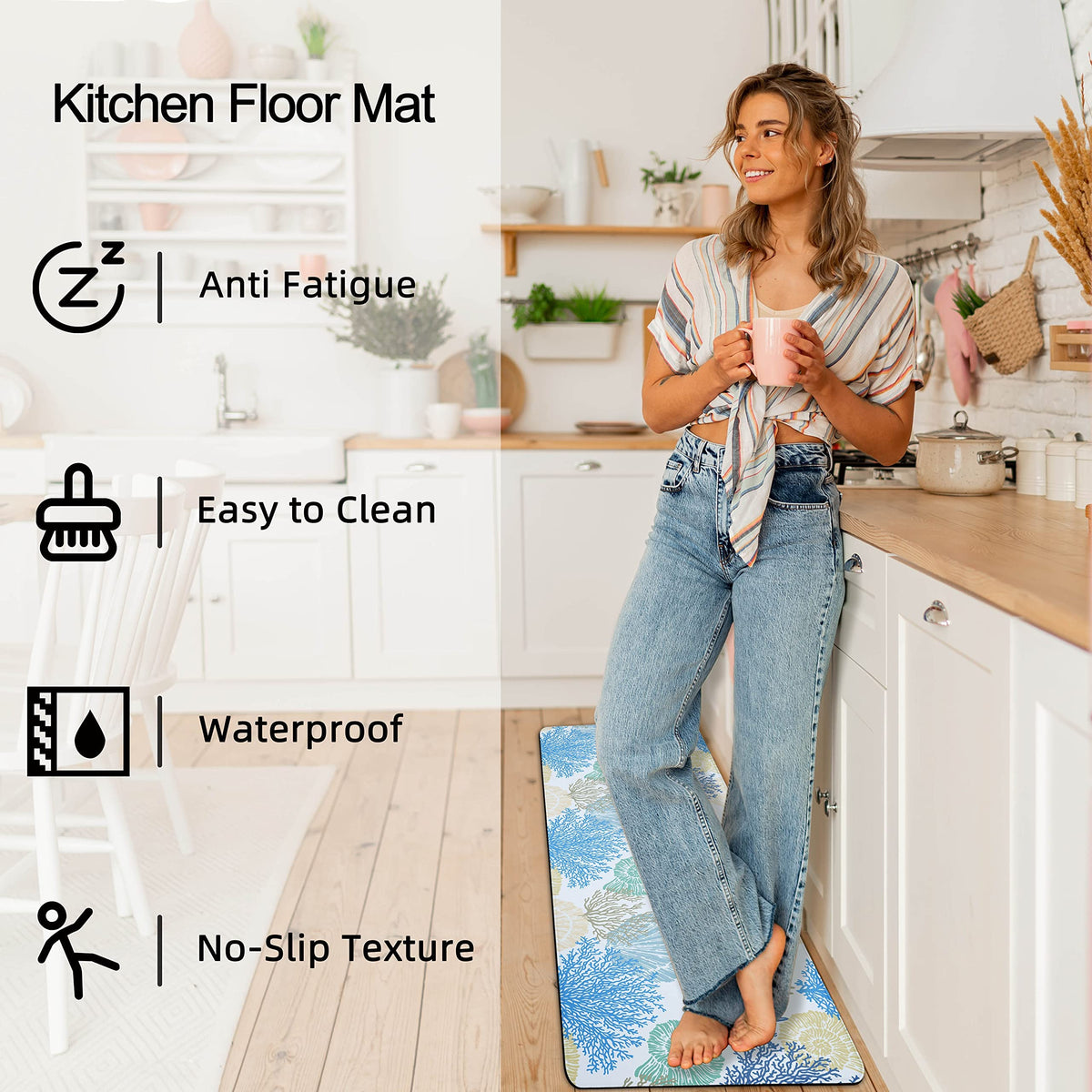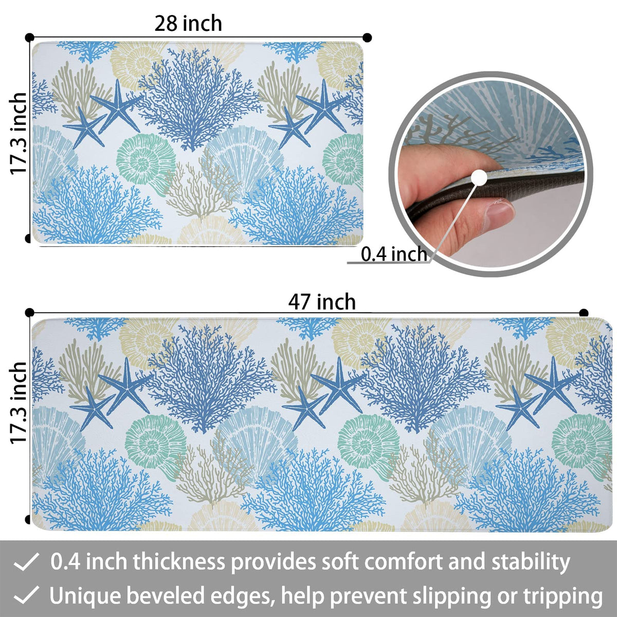 Tritard Coastal Beach Theme Kitchen Mats Rugs Set of 2 Anti Fatigue Kitchen Mats for Floor Memory Foam Cushioned Waterproof Non Slip Comfort Standing Mat for Sink Laundry Blue 17.3''x 28''+17.3''x 47''