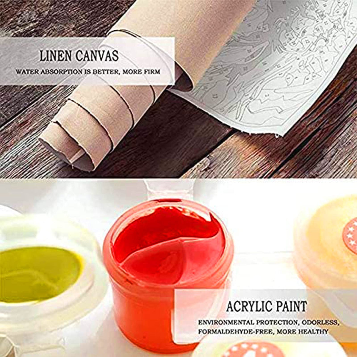 - Q: How do I use the paint by numbers kit? A: To use the kit, simply follow the preprinted numbers on the canvas that correspond to the labeled paint colors, applying the paint one section at a time.