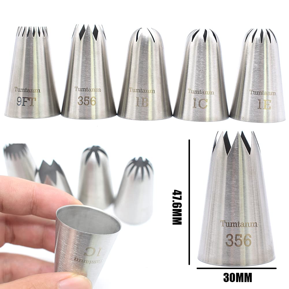 • Q: What sizes of piping nozzles are included in the Tumtanm set? A: The Tumtanm piping nozzle set includes five extra large nozzles, specifically sizes 9FT, 1B, 1C, 1E, and 356.