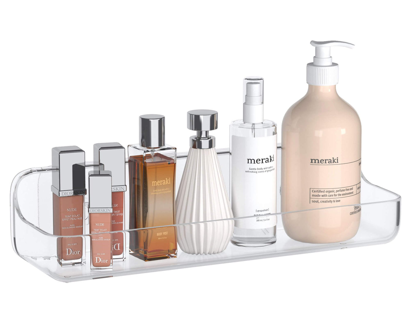 - Q: How does the self-adhesive feature work? A: The self-adhesive feature utilizes a powerful traceless adhesive that allows the caddy to firmly stick to smooth, solid walls without affecting its clear appearance.