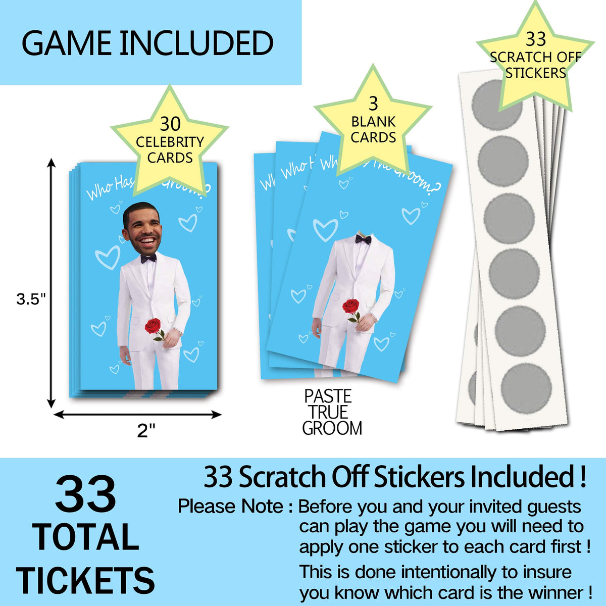 • Q: How do you play the Scratch Off Bridal Shower Game? A: To play the game, print a true groom’s image, cut it into a circle of 1 inch, and paste it onto one of the blank cards. Place the scratch-off stickers on the cards. Guests will either find the card under their chair or receive it when they arrive, and the winner is the one who reveals the true groom.