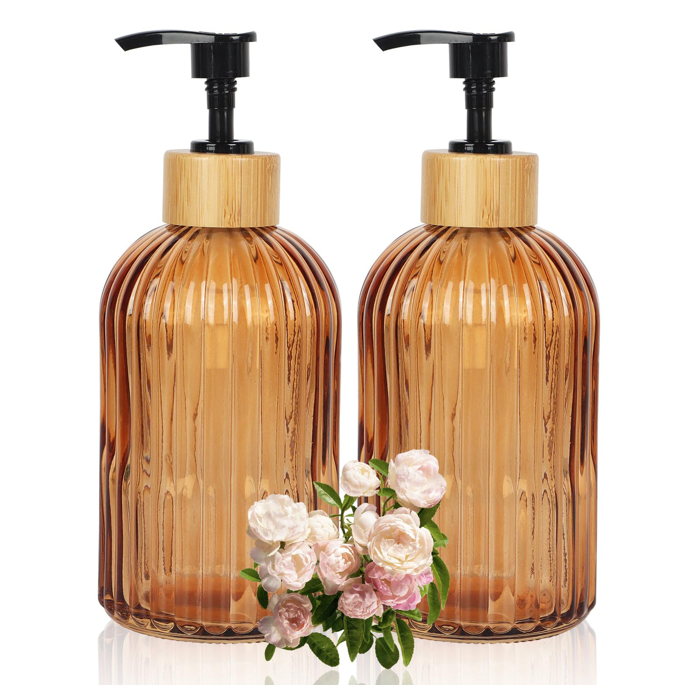 Ulable Amber Glass Soap Dispenser With Pump, 2 Pack 13.5Oz Vertical Stripe Design Hand Soap Dispenser For Hand Wash, Dish Wash,