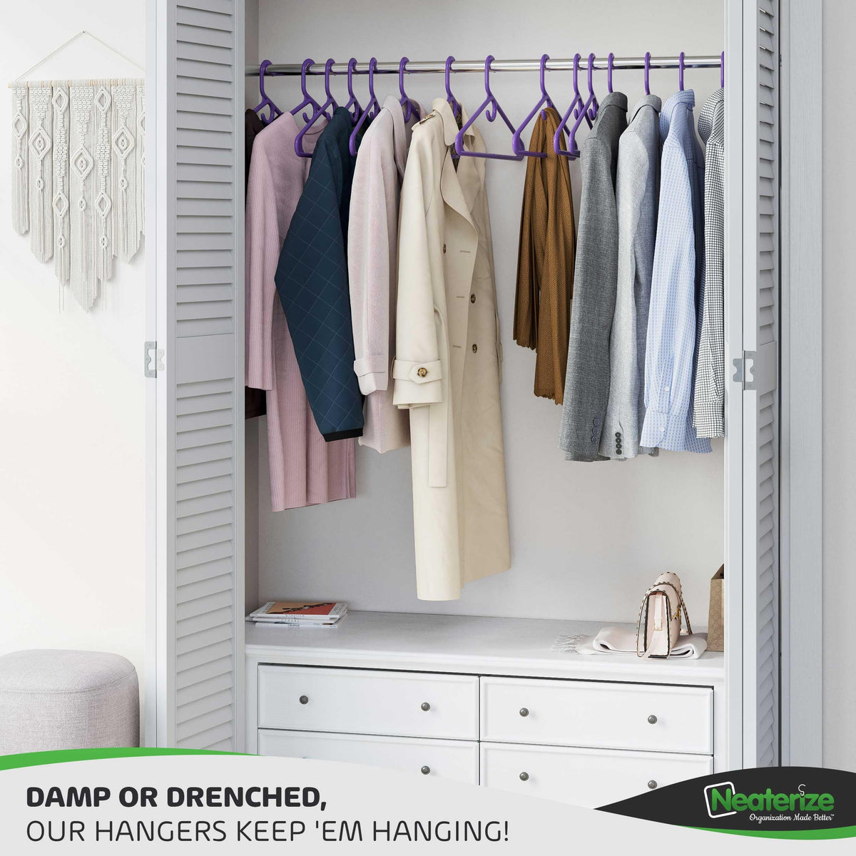 • Q: What colors are available for these hangers? A: The NEATERIZE hangers are available in a vibrant array of 7 colors, including black, white, navy blue, grey, purple, and pink.