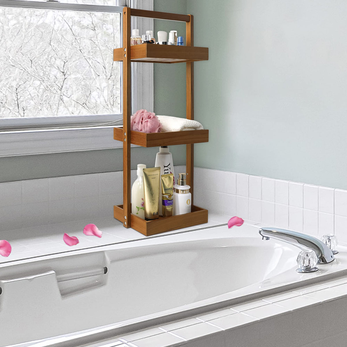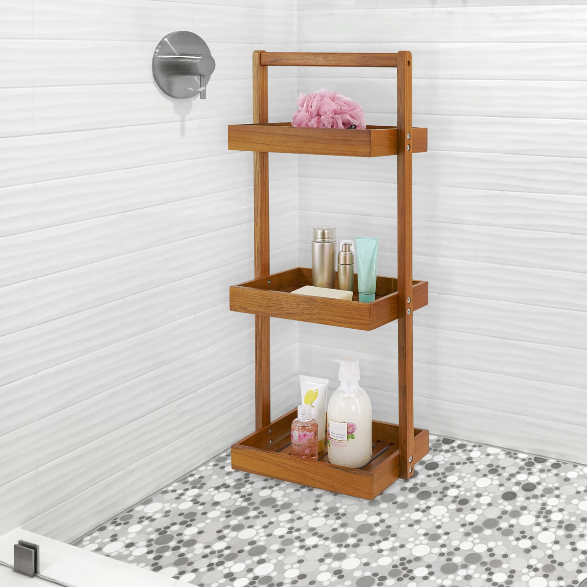 • Q: Is the shower caddy resistant to water damage? A: Teak wood is naturally resistant to water and decay, making it an excellent choice for humid environments like bathrooms.