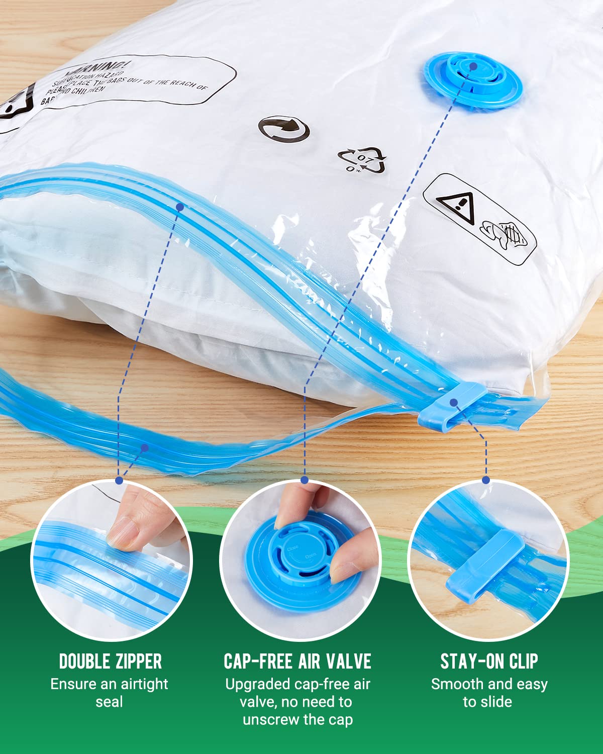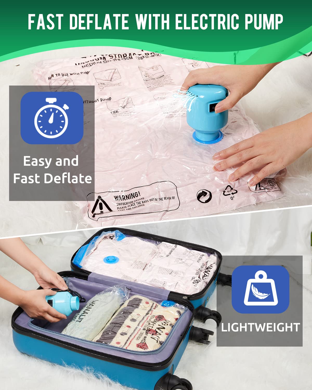 ?Reduce Bags Volume by 80%?Our vacuum storage bags are designed to help neatly organize your closet and store clothes, after using it, you can fell that your bedroom or apartment become a clutter-free and bigger zone, and able to pack more luggage into your suitcase when you travel, and use the thick and heavy duty polyester material, which can ensure you to use again and again and store the clothes for a long time | ?10pack Medium Bags?Come with 10pack medium size (28x 18), which allows you to stuff clothes, down jacket, coats, sweatshirts, pillows, multiple sets of sheets, sleeping bags, blankets, towels and so on | ?Upgraded 2 Ways to Compress?Our vacuum storage bags are upgraded on the air valve which is not only cap-free design, also allows you draw the air out of the bags with 2 ways.Firstly you can use the included electric pump to take the air air out of the bags, which is powerful and very fast. Secondly, you can directly use your hands to press the bags to make the air out of the bags | ?Come with An Compact Electric Pump? Using electric pump to suck the air out of the vacuum bags is faster and easier compared with the hand pump. After packing the bags, all you have to do is waiting the electric pump to take all of the air out of the bag. Then, just turn the cap to right to make an airtight seal | ?Create Air-tight and Waterproof Seal?Designed with double zip seal and triple seal turbo valve, which can ensure the vacuum Bag 100% airtight after sealed, leading to high levels of protection as well as higher efficiency in storage. Great to protect your valuable belongings from being ruined !