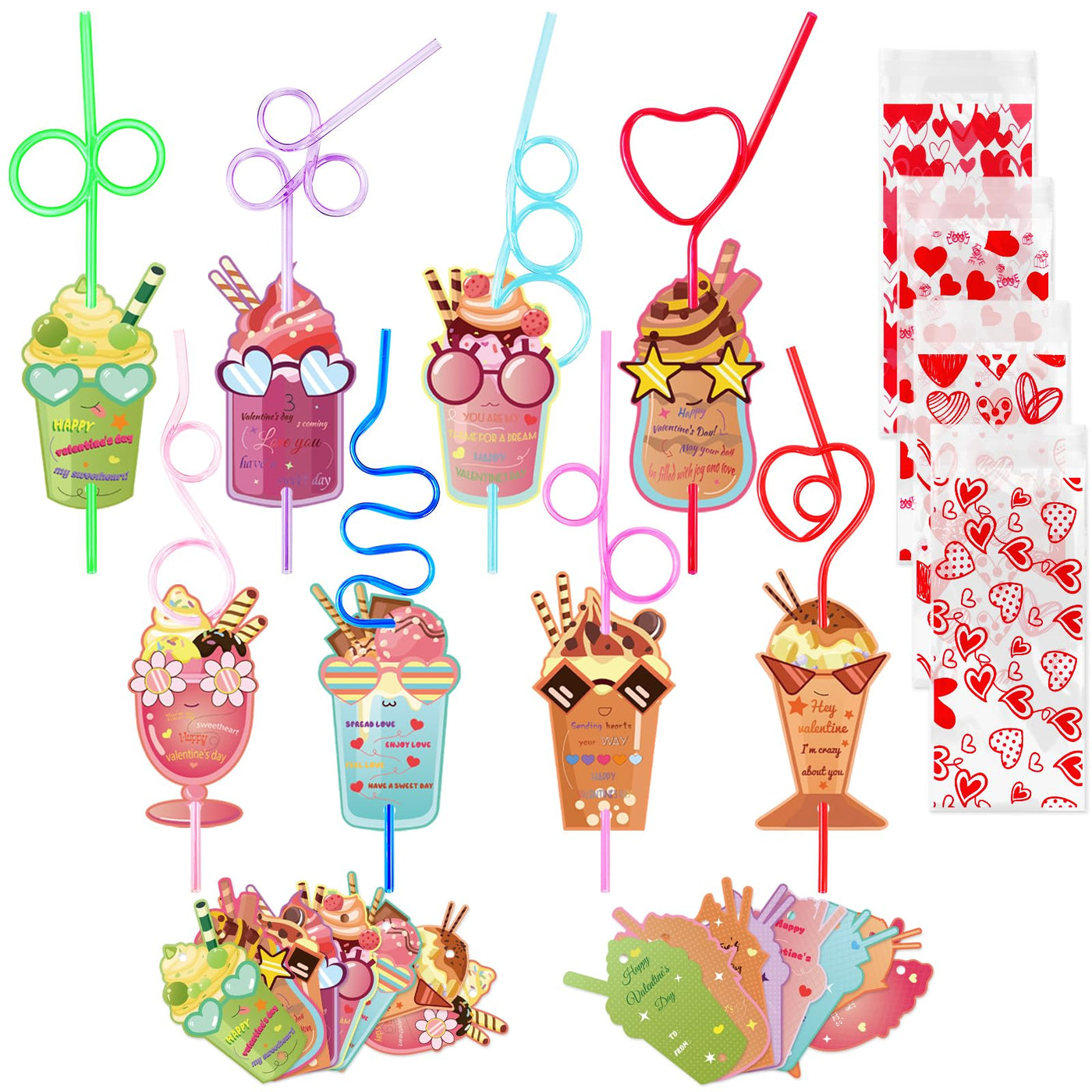 - Q: What is included in the Valentines Day Cards with Straws set? A: The set includes 32 Valentine's Day cards with 8 unique designs, 32 silly drinking straws with 8 different designs, and 32 bags featuring 4 designs.