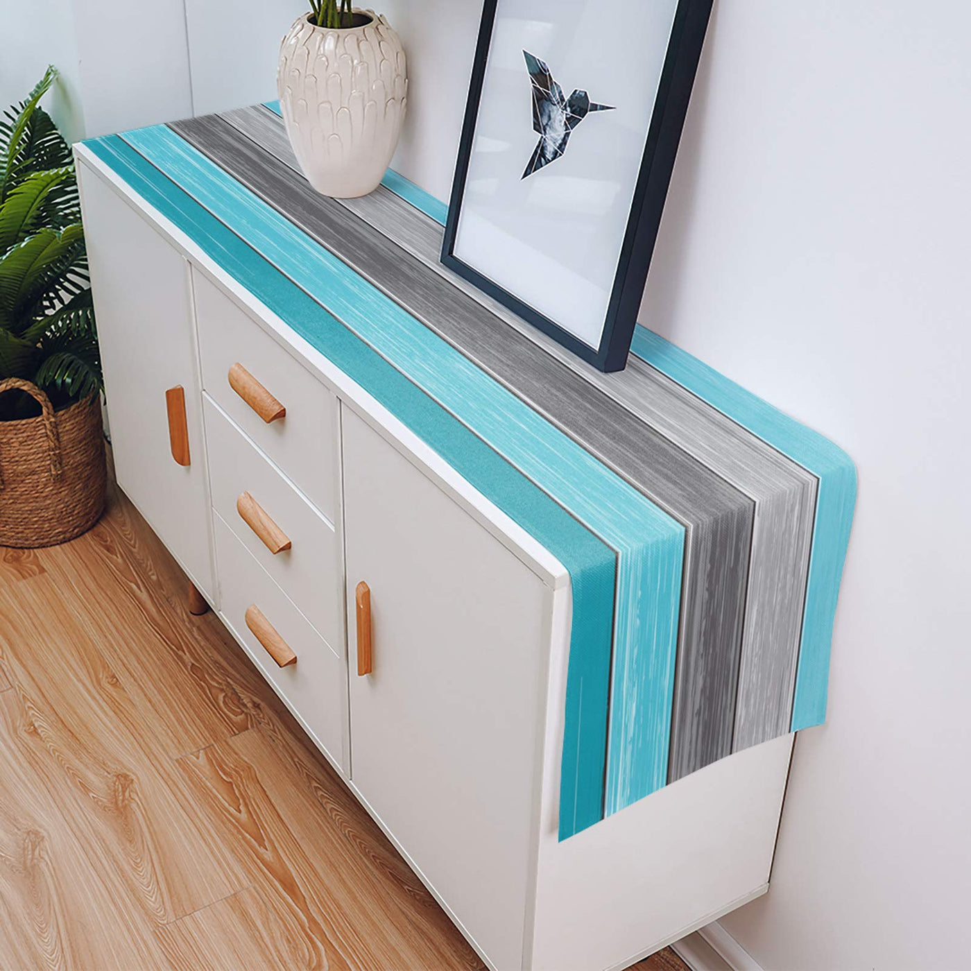 - Q: What color options are available for this table runner? A: The table runner features a retro rustic barn wood texture in ombre aqua blue and gray, adding a stylish touch to your decor.