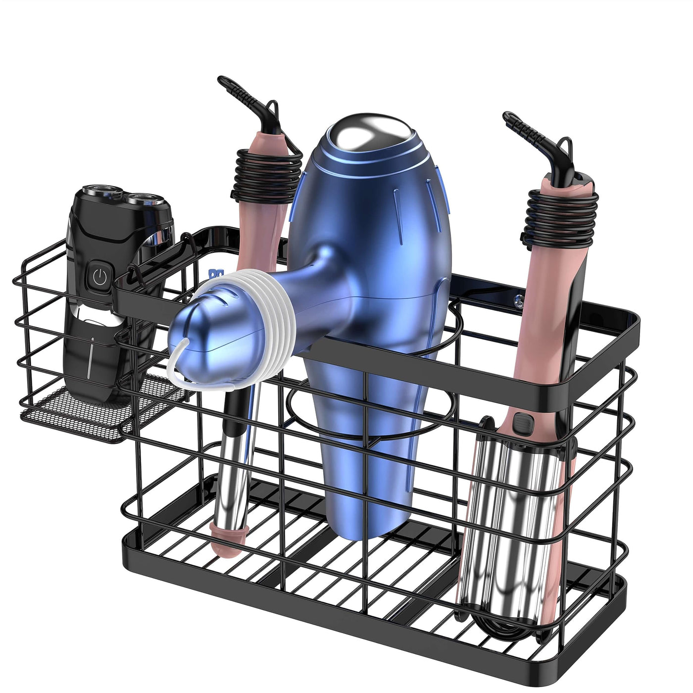 Vecallo Hair Tool Organizer - Black Steel Wall Mounted Hair Dryer Holder With Removable Basket, 10.62''L X 4.33''W X 6.69''H, Id