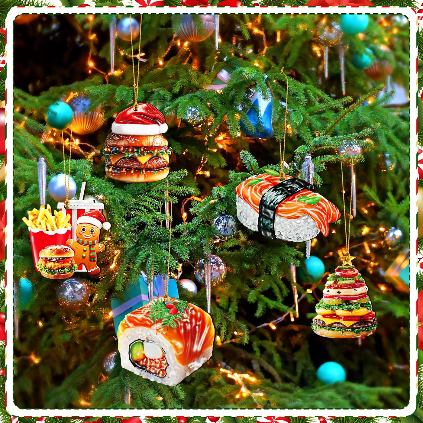Vercraft 20 Pcs Food Christmas Ornaments with Santa Hat Flat Wooden Kitchen Cuisine Cutouts Burgers Pizza Sushi Tree Ornaments w