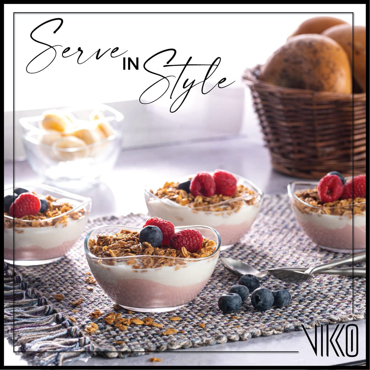 - Q: What material are the Vikko Dessert Bowls made of? A: The Vikko Dessert Bowls are made of clear, durable glass, designed to withstand daily use.