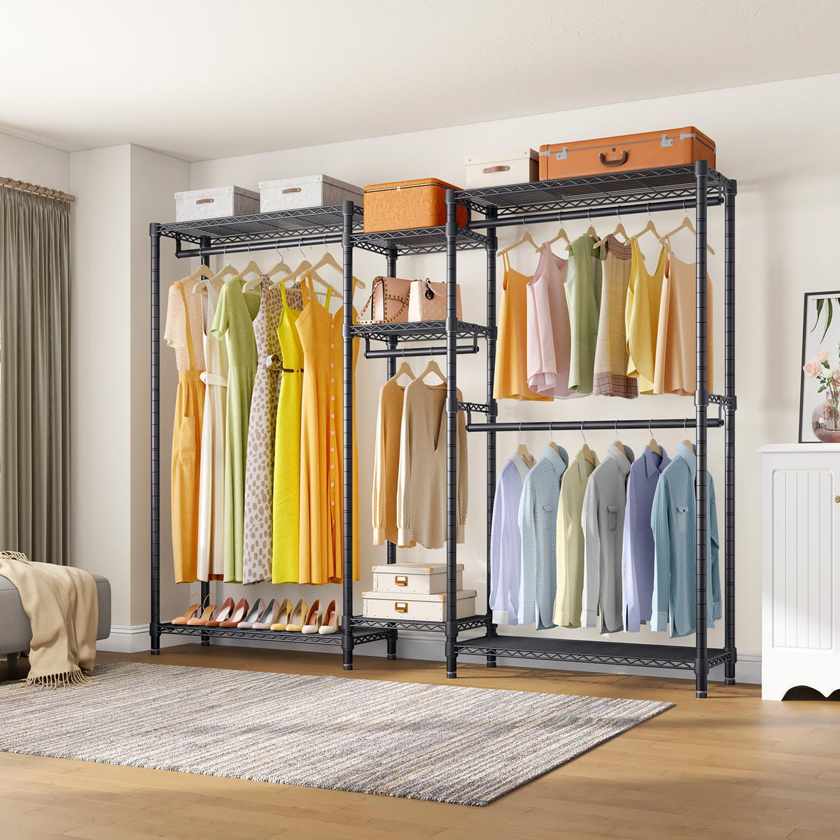 • Q: What types of clothing can I store on this rack? A: You can store a variety of clothing items, including suits, coats, long dresses, jackets, pants, shirts, and more.