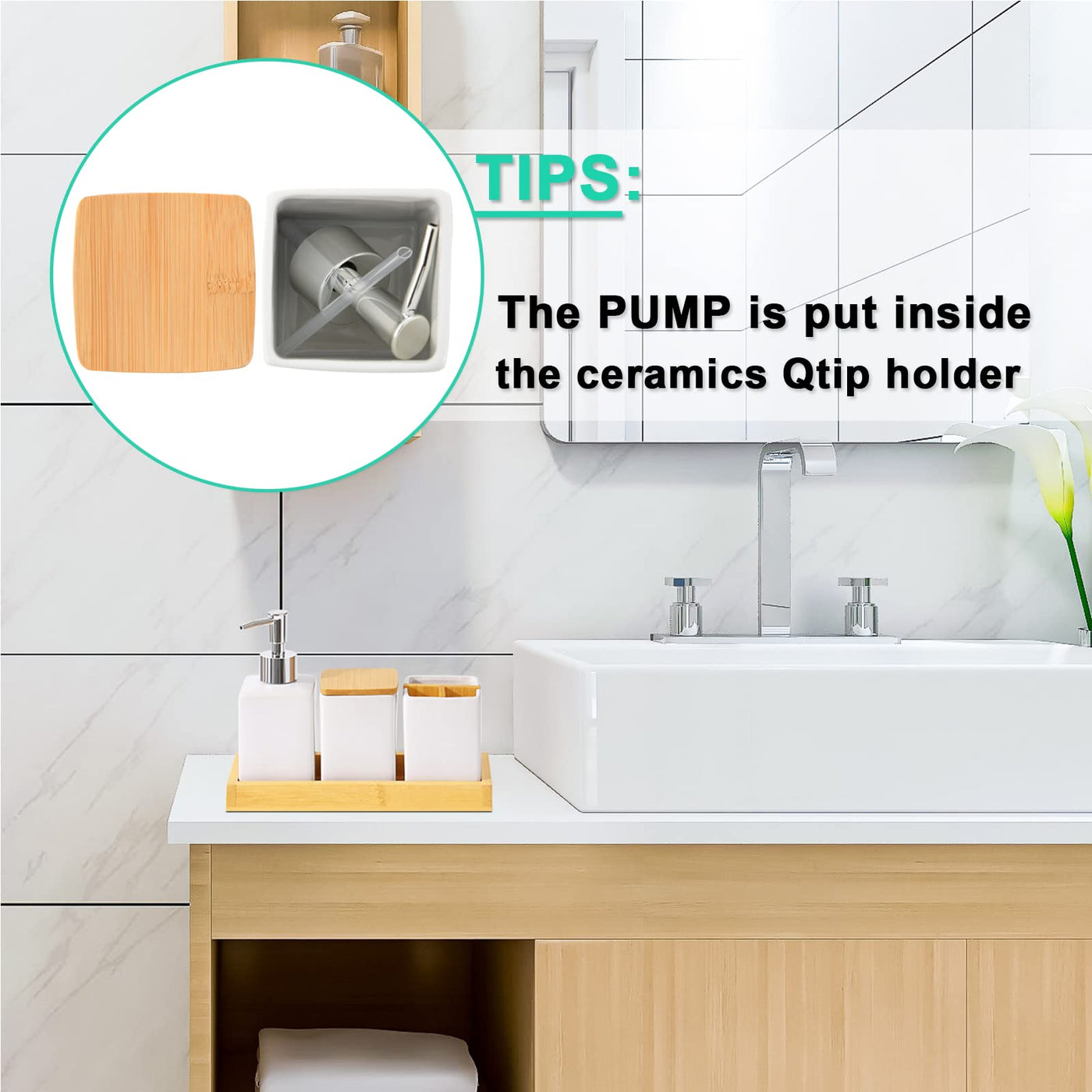 - Q: What items are included in the bathroom accessories set? A: The set includes 1 toothbrush holder, 1 soap dispenser, 1 bamboo tray, and 1 cotton swab jar.