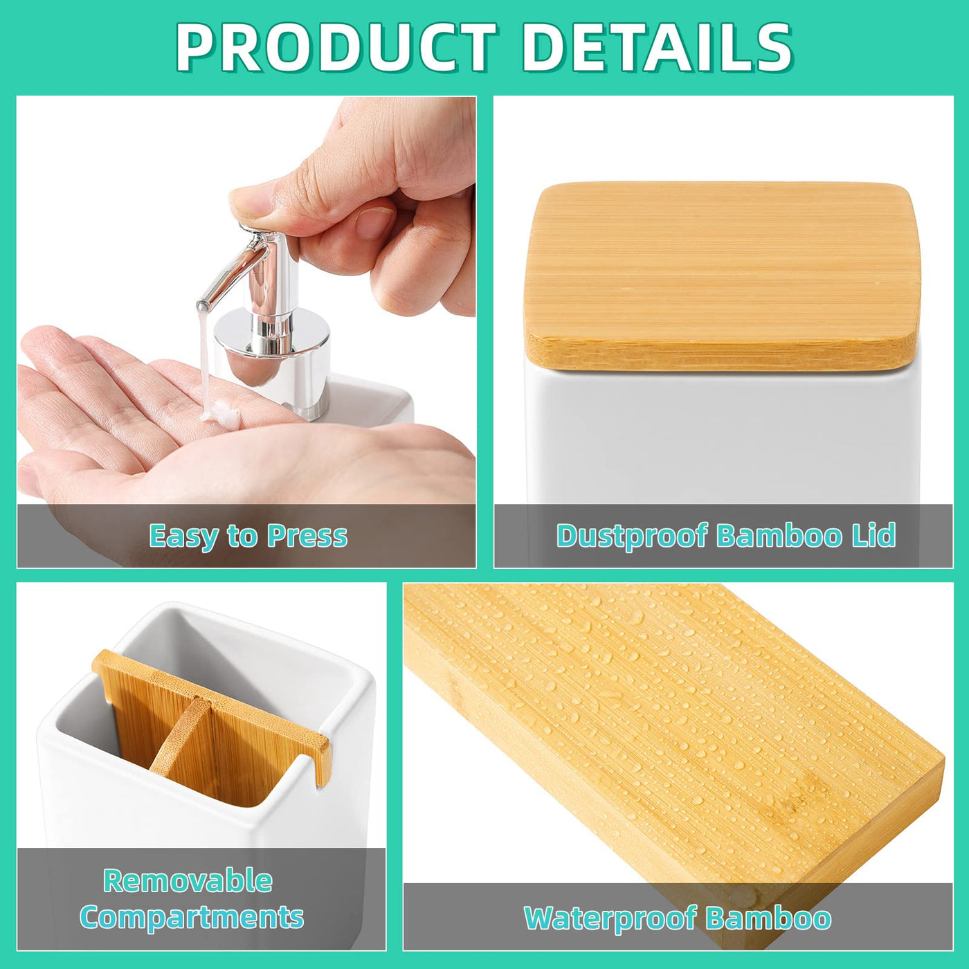 Vitviti Bamboo Bathroom Accessories, White Bathroom Organizer Countertop, Soap Dispenser And Toothbrush Holder Set, Vanity Tray