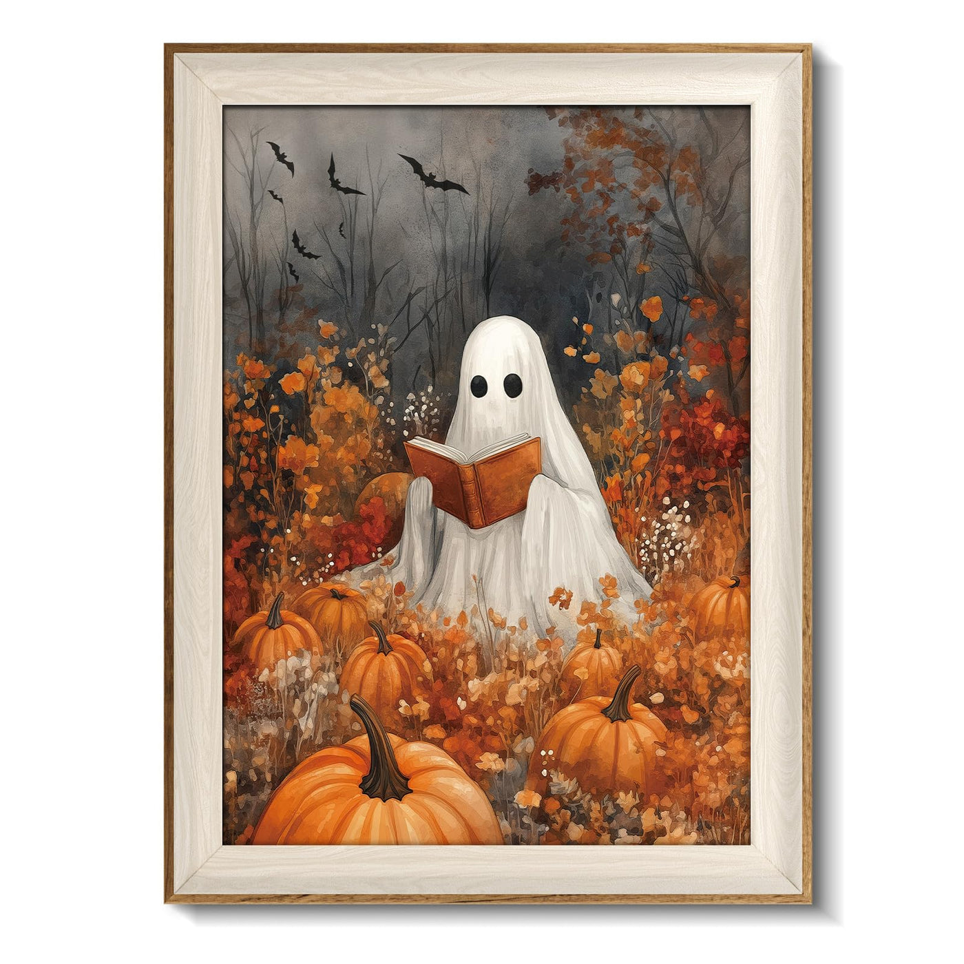 VIYYIEA Framed Wall Art for Living Room, Reading Ghost Canvas Prints, Autumn Home Decor, Halloween Painting Picture, Bathroom Wa