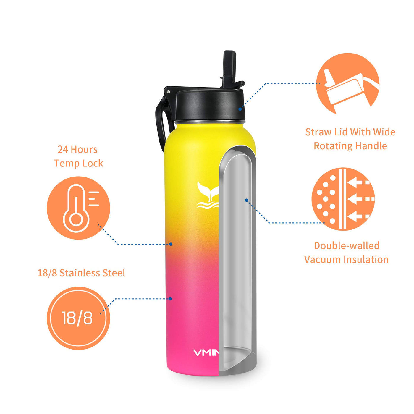 Vmini Water Bottle With Straw, Wide Rotating Handle Straw Lid, Wide Mouth Vacuum Insulated Stainless Steel Water Bottle, Gradien