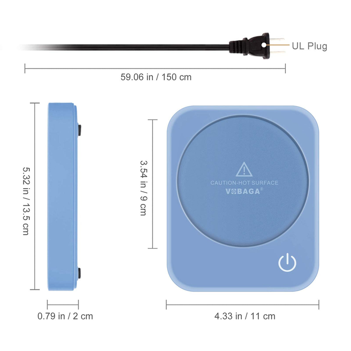 • Q: How long is the power cord for the VOBAGA Coffee Mug Warmer? A: The power cord measures 59 inches long, providing flexibility in placement on your desk.