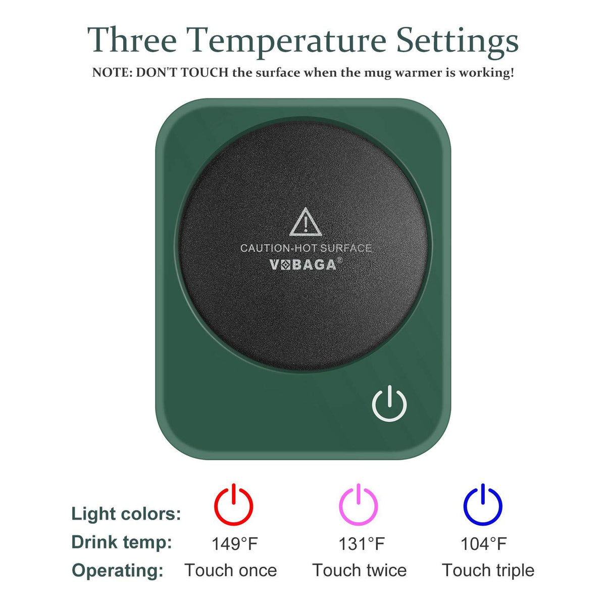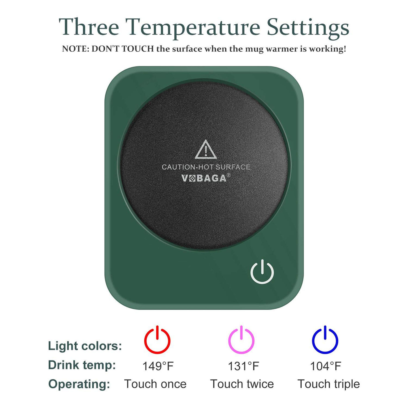 - Q: What are the temperature settings available on the VOBAGA Coffee Mug Warmer? A: The VOBAGA Coffee Mug Warmer features three adjustable temperature settings: 104°F, 131°F, and 149°F, allowing you to keep your coffee or milk at your preferred drinking temperature.