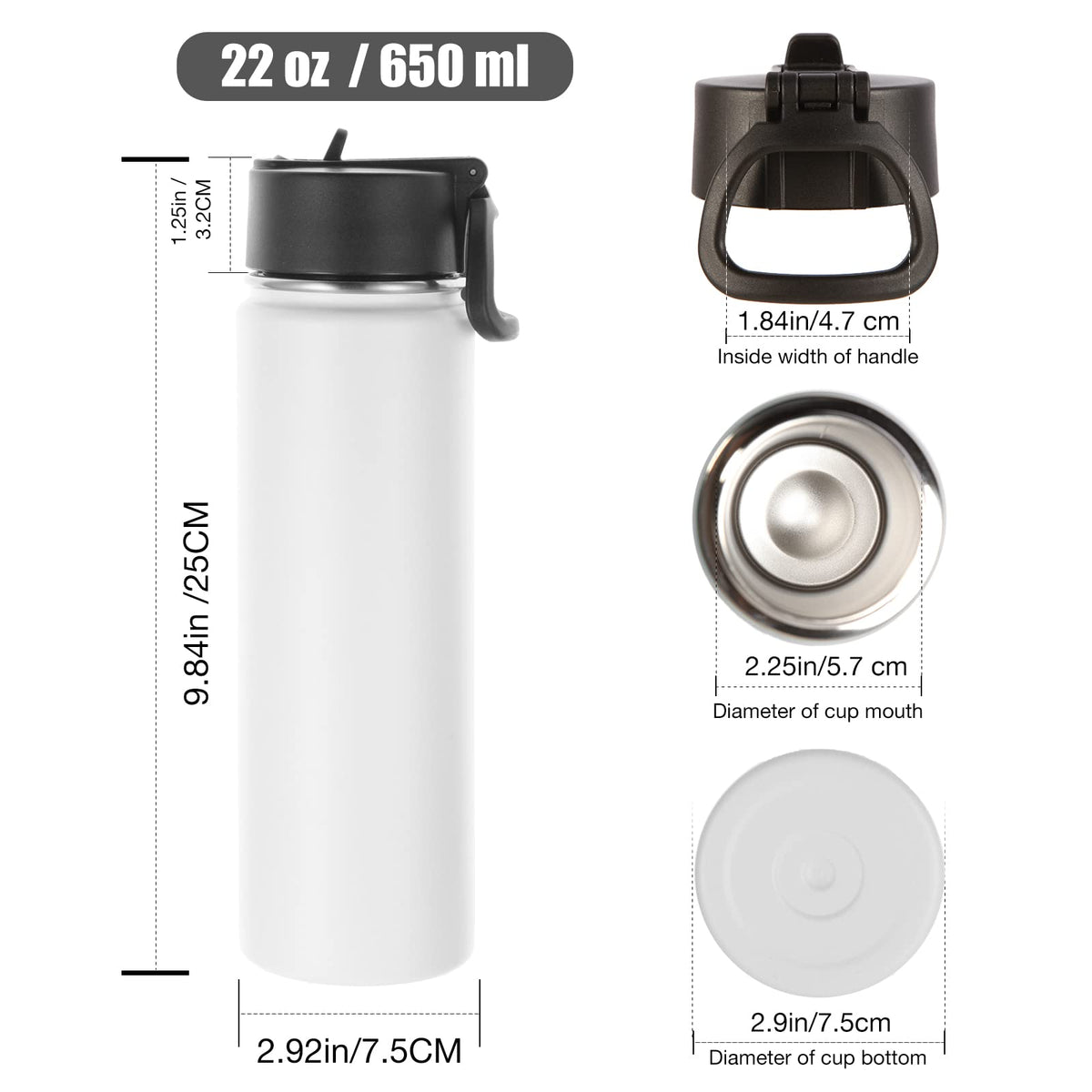 Volhoply Insulated Water Bottles with Straw Bulk 2 Pack 22 oz Stainless Steel Sports Bottle with Handle Lid Double Walled Vacuum Metal Water Thermos Reusable Cold Water Flask for School(White 2 Set)