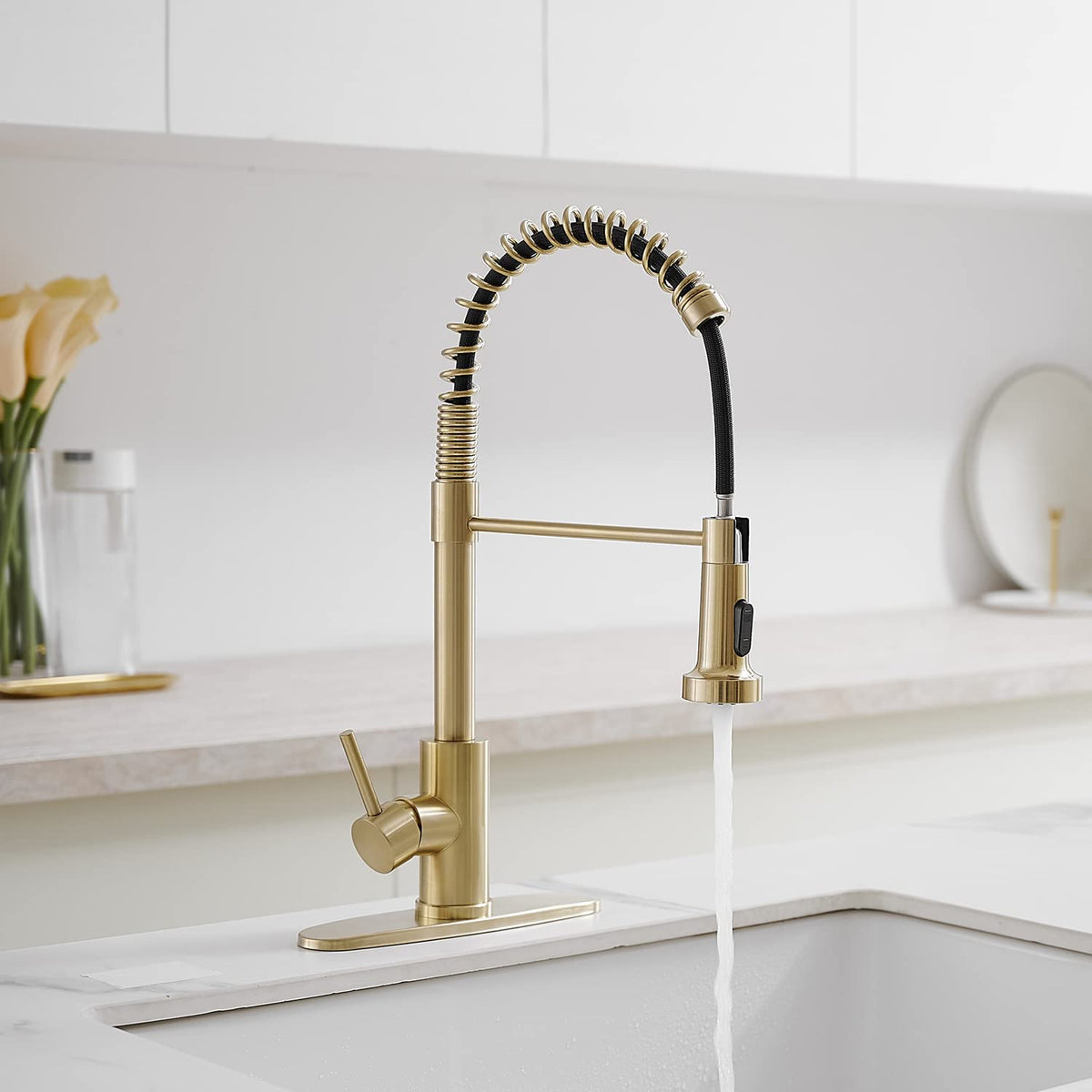 VOTON Kitchen Faucets with Pull Out Sprayer Commercial Spring Kitchen Sink Faucet Brushed Gold Single Handle Kitchen faucets with Deck Plate