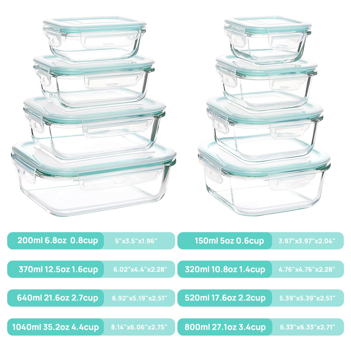 - Q: What sizes are included in the 8-pack of containers? A: The 8-pack includes rectangle containers of 35.1 ounces, 21.6 ounces, 12.5 ounces, and 5 ounces, as well as square containers of 27.1 ounces, 17.6 ounces, 10.8 ounces, and 6.8 ounces.