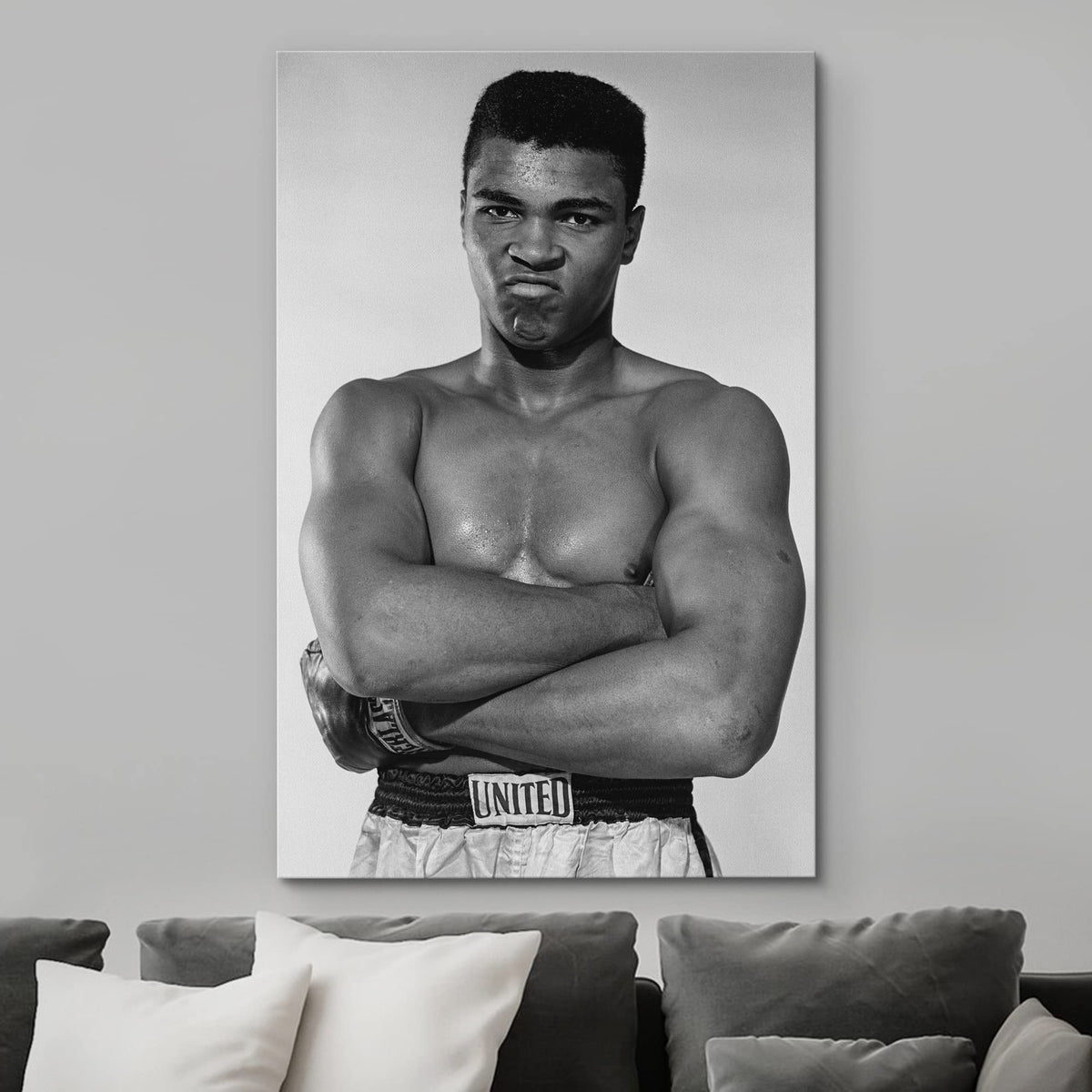 - Q: What is the artwork's design style? A: This canvas print features a duotone design of the famous African American boxer, Muhammad Ali, presented in a vintage retro style.
