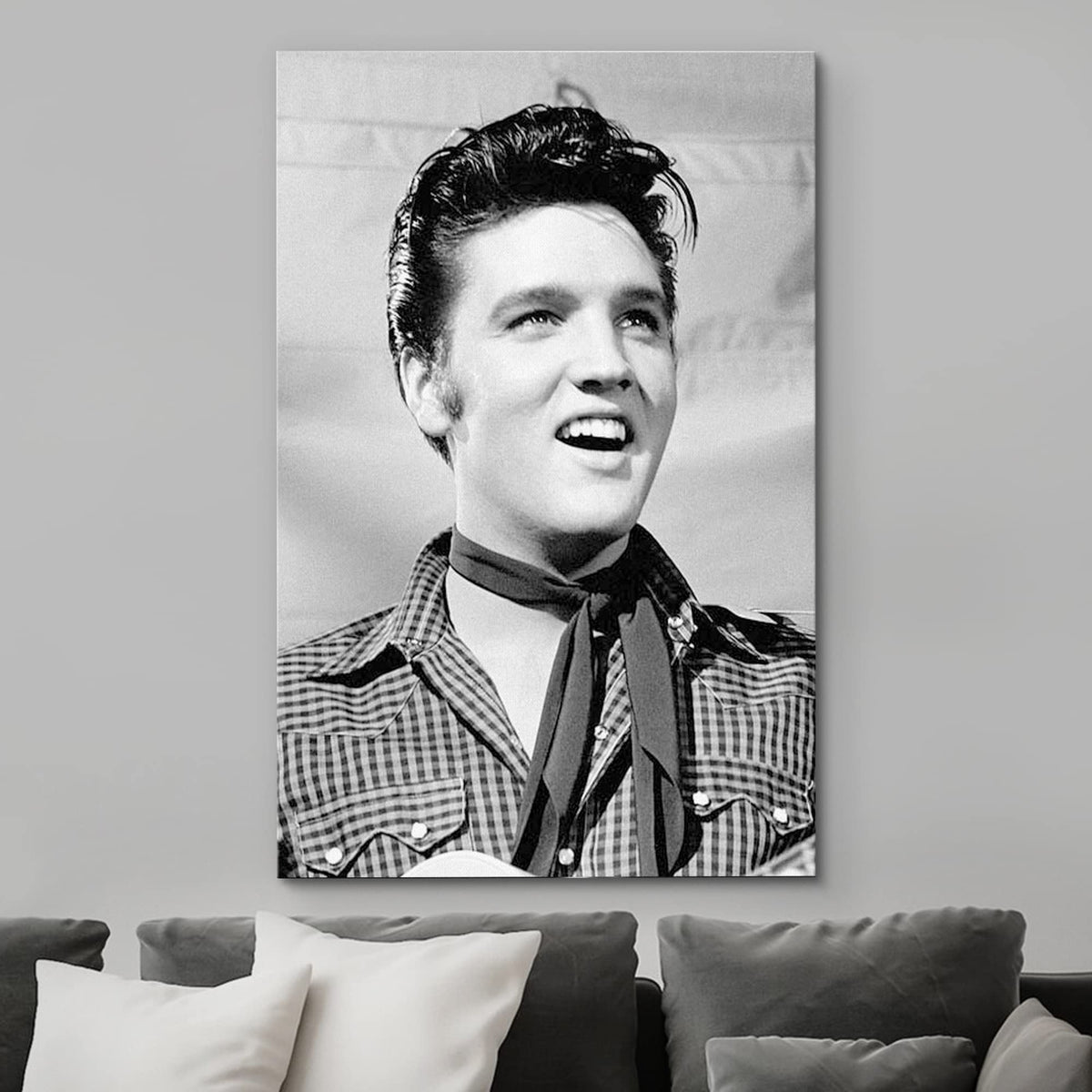 - Q: What style of art does this print represent? A: This canvas print features a traditional portrait of Elvis Presley, capturing classic photography realism in a vintage retro style.