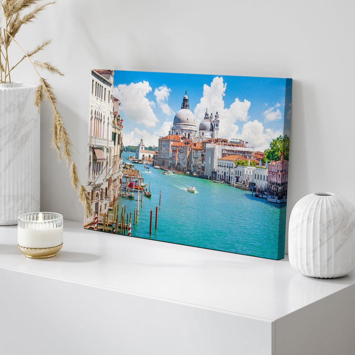 - Q: What type of artwork is featured in this print? A: This print features a scenic photograph of the Gran Canal with Basilica Santa Maria in Venice, Italy.